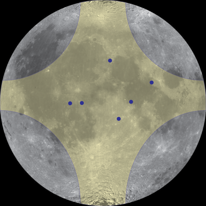 Possible landing sites of Apollo, highlighted. Apollo could not land at mid-latitudes with Earth low on the horizon. Also shown: the landing sites for manned Apollo missions