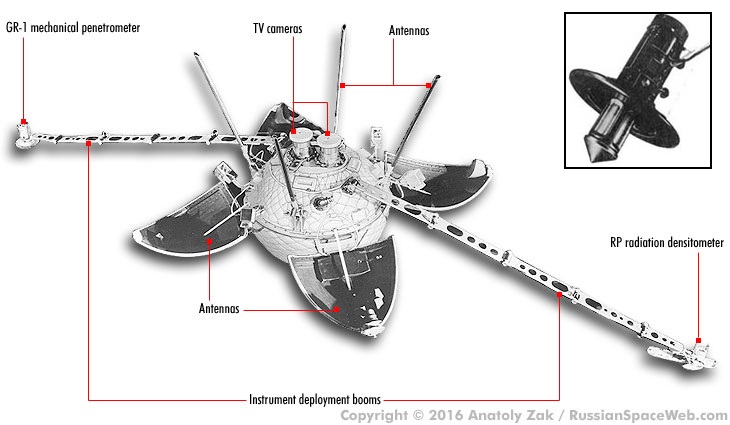 Luna 13 with a close-up of the rocket-powered penetrometer. Source: RusssianSpaceWeb.com