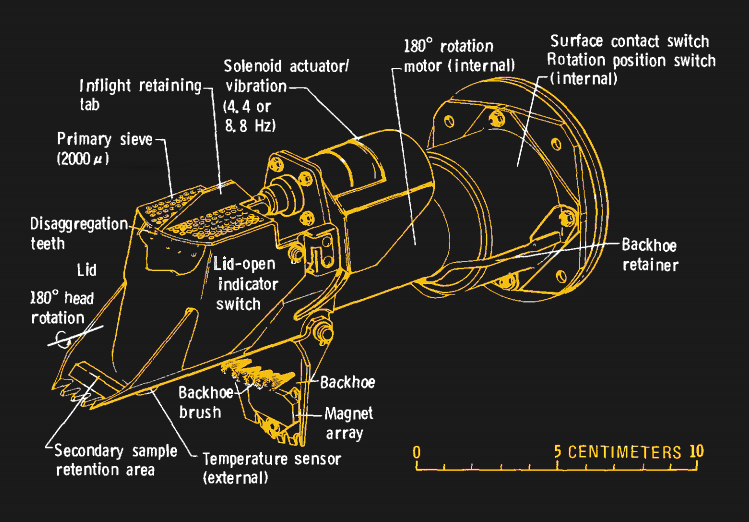 That first human-made hole in the Moon was followed four months later by Surveyor 3, one of a series of American probes designed to find suitable locations for landing the planned Apollo missions. The lander carried a Soil Mechanics Surface Sampler (SMSS), and extendible pantograph arm with a small soil scoop on the end. The arm had azimuth and elevation control motors in its base, allowing it to range in a wide arc, and telemetry allowed engineers to infer the forces on the regolith from the current drawn by the motors. The SMSS was very busy for 18 hours, controlled in near real-time through the lander’s slow-scan TV camera. It dug multiple trenches, pressed down on the lunar surface, and did impact tests by dropping the scoop from a height. It even picked up a rock and tried to crush it; sadly, the scoop didn’t have enough oomph for that.