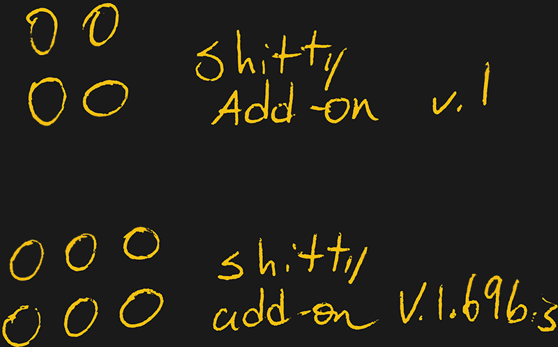 A standard isn’t a standard unless there’s a better one, so now the community of badge makers has settled on a newer, betterer standard for Shitty Add-Ons. It’s Shitty Add-On V.1.69bis (SAO.69), and it vastly increases the capability of the Shitty Add-On standard while retaining backwards compatibility.