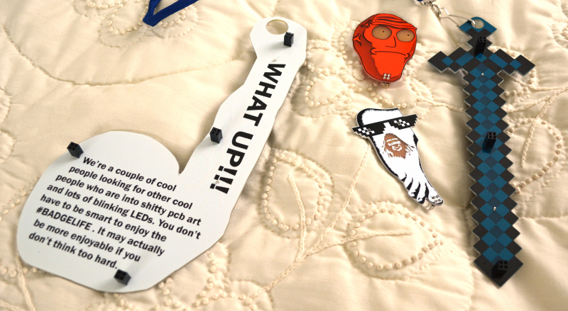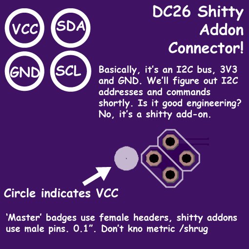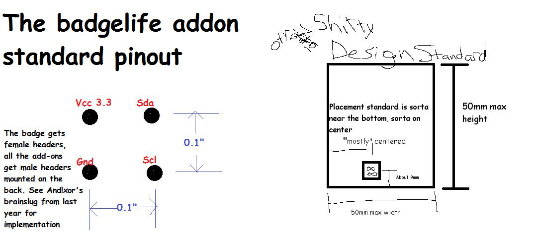 After literal minutes of discussion, we had a standard. It was decided that the Shitty Add-On pinout should include 3.3V, Ground, and an I2C bus on four headers arranged on a 0.1″ grid. The badges would have female sockets (or just through-holes), while the add-ons would have male pins. This is the first, and only, official documentation of the electrical and mechanical specifications of the Shitty Add-On standard. No one followed the standard, but everything worked out in the end.