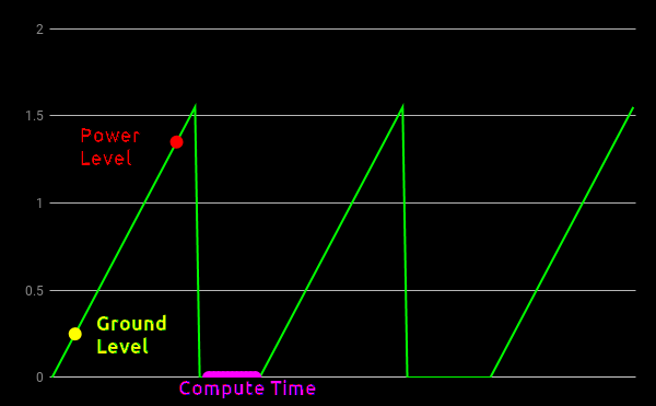 Apparently, the external system drives the CPU by sending an intermittent ascending ramp voltage over the single wire. The charge enters both a ground storage capacitor and a power capacitor. When the voltage ramp reaches a certain threshold, a FET turns off, isolating the ground storage capacitor. The power capacitor continues to charge until there is enough potential difference between the two capacitors to operate the circuitry (see chart, right). The ramp then goes to zero which allows the CPU or the external system to communicate during the time before the next ramp begins.