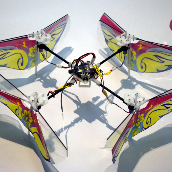 Last but certainly not least is the Flapping-Wing Micro Air Vehicle (FWMAV) from the University of California, Irvine. Essentially, the team took the traditional quadcopter design we’re all familiar with and replaced the spinning propellers with four sets of ornithopter wings. The amalgamation of these two vastly different styles of flight results in a vehicle with the maneuverability of a quadcopter but without the noise and hazardous blades which thus far have been considered part and parcel with small UAVs.
