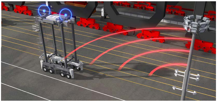 Being able to squeeze more containers into the same space relies on location data that GPS would never be able to achieve, so the straddle carriers instead use a local positioning system based on time-of-flight from a series of transmitters located on poles around the yard. This allows the straddle carriers to achieve positional accuracy of 1 inch (25.4 mm).