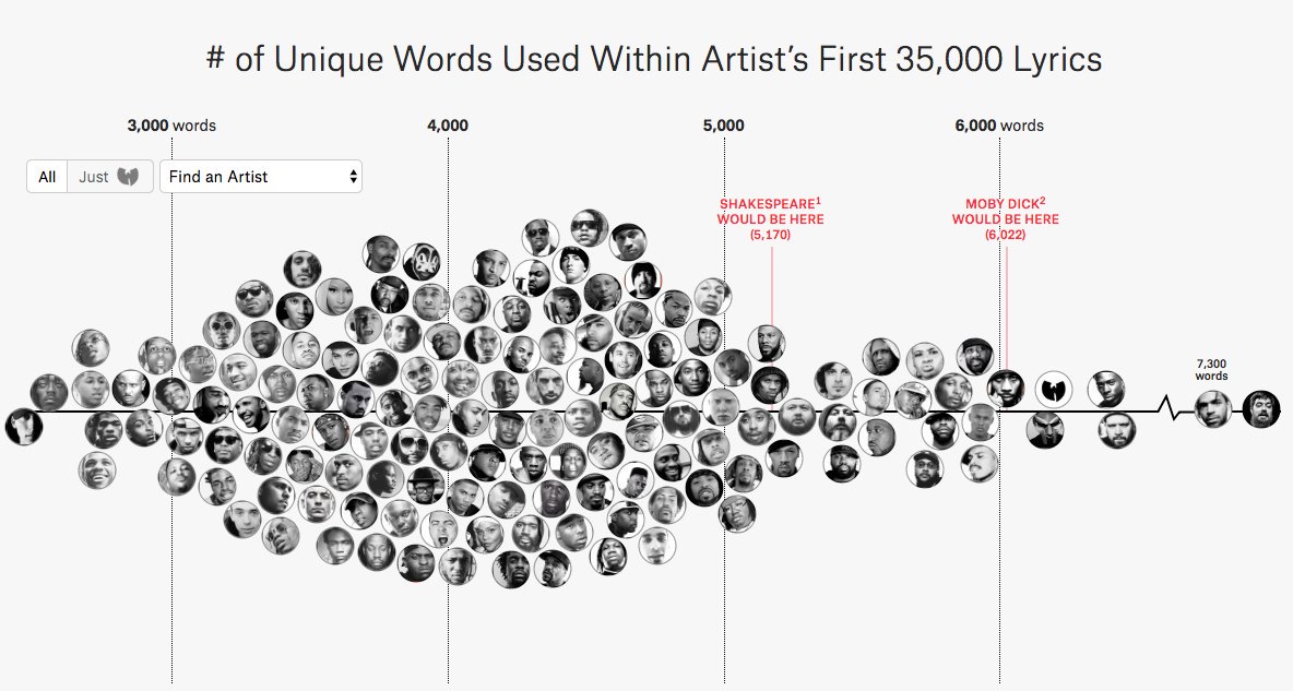 The study encompasses hip-hop artists from the last thirty years, pitting recent hit-makers like Lil Uzi Vert against veteran artists like KRS-One. To ensure everything is on even playing field [Matt] limited the study to the first 35,000 lyrics of each artist including any material on a mixtape, EP, or full album release. Rappers’ vocabulary was then plotted according to the total number of unique words found in their lyrics (i.e.: “shorty” and the alternative spelling “shawty” were each considered to be unique words). Oddly enough, there were some notable exclusions from the list as artists like Chance the Rapper, Queen Latifah, and The Notorious B.I.G’s discography did not exceed the 35,000 lyrics mark.