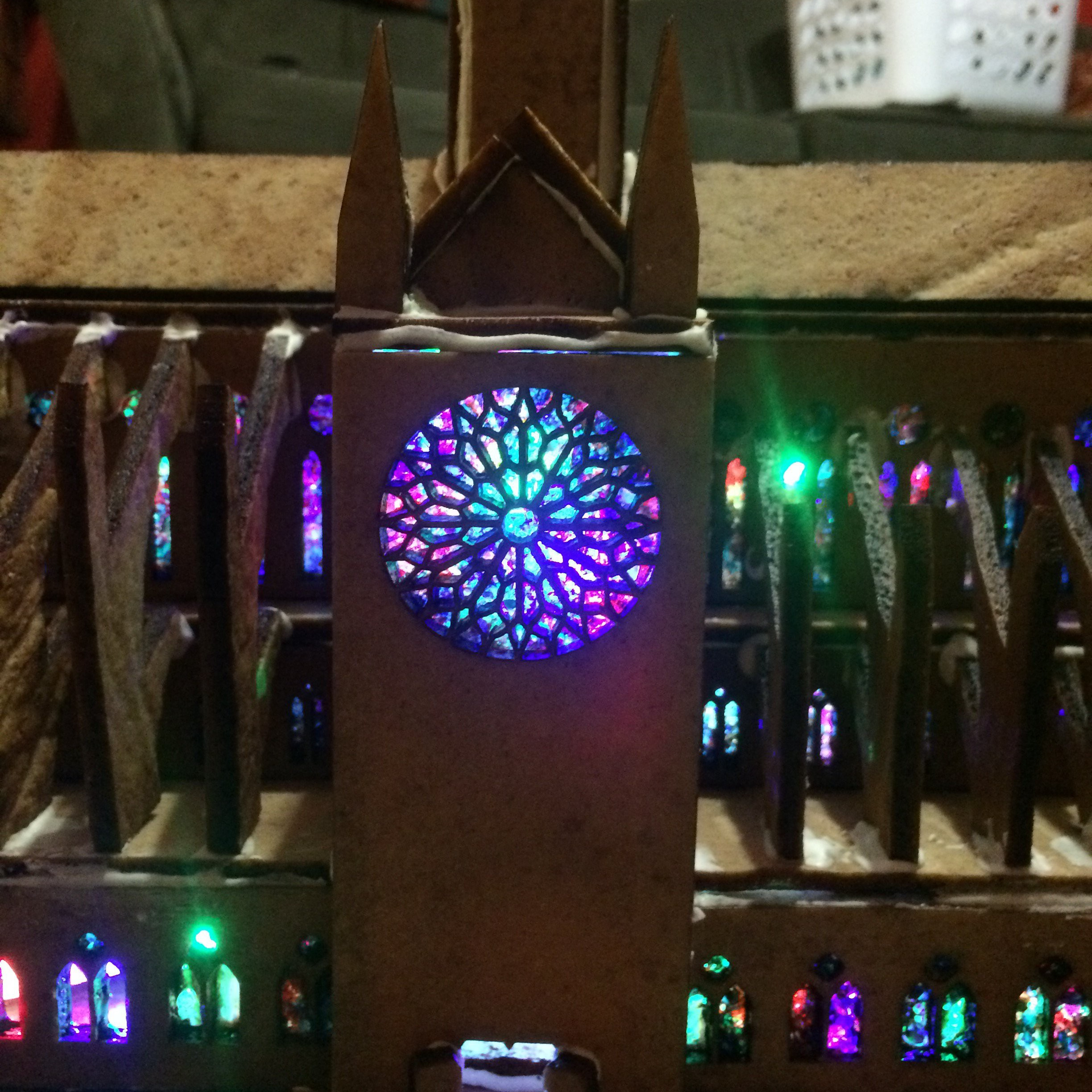 With parts cut out, royal frosting was used as a mortar to help stick parts together during assembly. Significant development time was also spent in perfecting the stained glass windows, made from colored sugar. After much experimentation, a process involving melting the sugar on silicone sheets proved to be most successful. To complete the look, a series of RGB LEDs were also installed during the construction process.