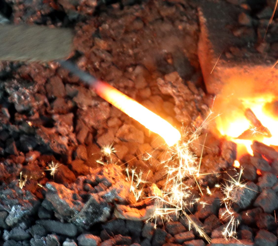 If you place the end of it, about 25 mm (1″) or so, into the hottest part of the fire where it is bright yellow, you can watch as it comes up to temperature. Ideally you want it to reach the point of being nearly but not quite as yellow as the coals around it at which point you can withdraw it and start work. If you leave it in too long it will first start to burn such that it will be sparking like a firework sparkler when you withdraw it, and if you leave it in longer still it will start to melt.