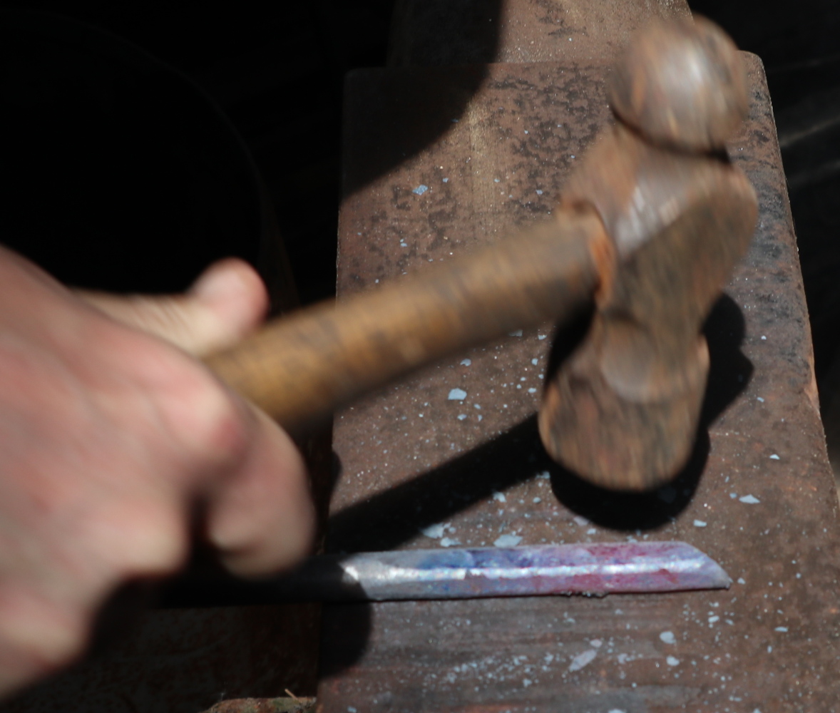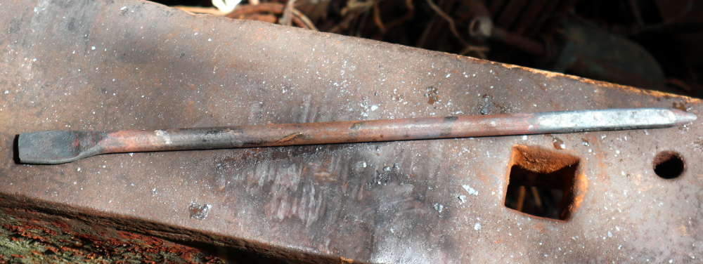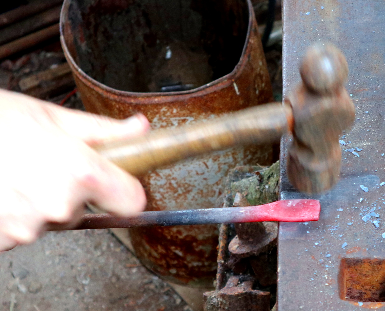 Hammering a flat on the end of a piece of bar stock. Mine has by good fortune remained consistent, but don’t worry if yours has a slightly oval shape.