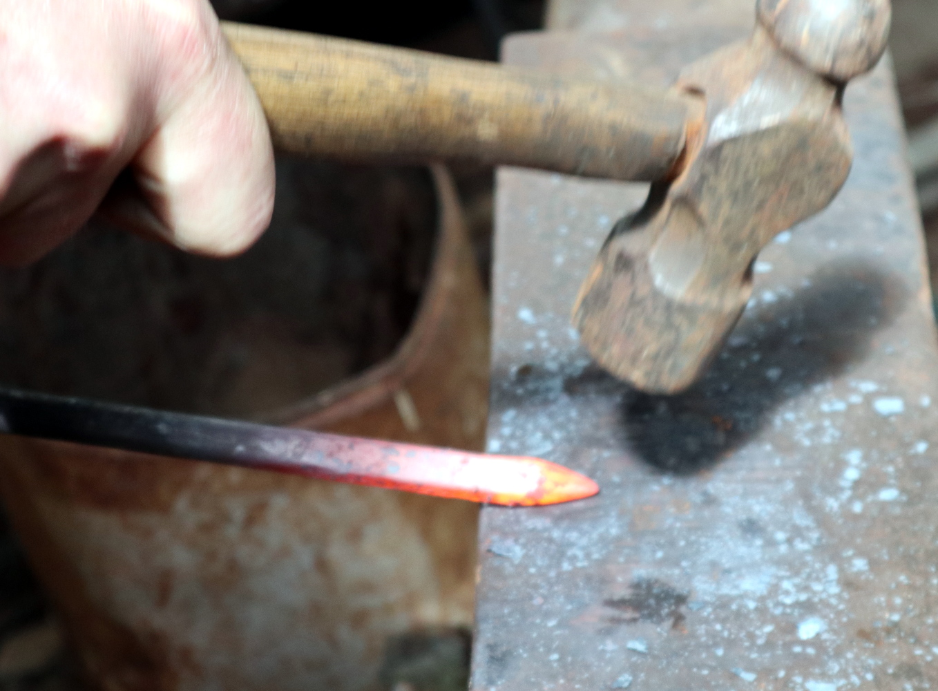 Given a piece of 10 mm steel with its end 25 mm yellow-hot, holding it by the cold end you can place it on the face of the anvil. Hammer the hot end repeatedly in the same place, and it will start to spread out.  You’re not making anything here, instead it’s a simple exercise in getting used to both the metal and the hammering motion. Instead of lifting the hammer high for each stroke in the stereotypical image of a blacksmith, you are aiming to create a rhythm with it in your lower arm and wrist, taking full advantage of the rebound we mentioned when we looked at what makes a good anvil. As you hammer, you will see the work lose temperature, it will change from yellow through orange and red to a dull red with grey seeping in. At this point you will need to put it back in the coals as described above to bring it back up to temperature, and repeat the process.