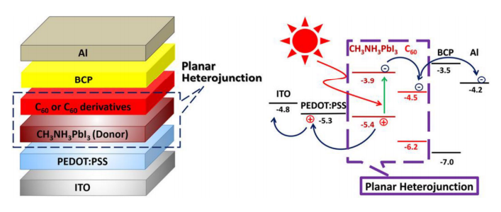 Schematic for a perovskite-fullerene PV cell. The methylammonium lead iodide acts as an electron donor, while the C60 fullerene layer acts as the acceptor. Source: Jeng et al, Methylammonium lead iodide perovskite/