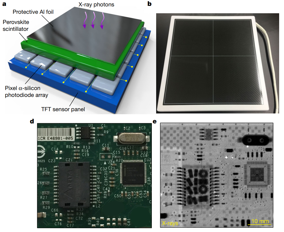 Schematic of perovskite x-ray sensor (a) and the actual panel (b). The x-ray image (e) of the PCB was made with the sensor. Source: Chen et al, All-inorganic perovskite nanocrystal scintillators.