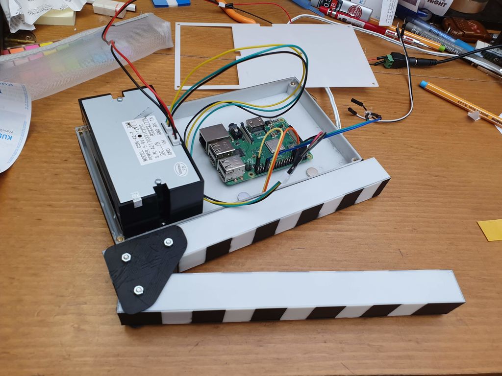 The poster is not a big, full color job, but rather a black and white one, roughly the size of a movie ticket. [Gocivici] keeps his movie tickets in a journal and wanted to be able to keep small posters in there along with them. A thermal printer is used to print the poster along with the title, the release date, and some information about the movie. In addition to the printer, the hardware involved is a Raspberry Pi, a switch, and an LED. The clapperboard itself is 3d printed and then painted. A bit of metal is used to keep the clappers apart and give a bit of resistance when pressing them together. A nice touch is a metal front, so you can use magnets to keep your posters on the board.