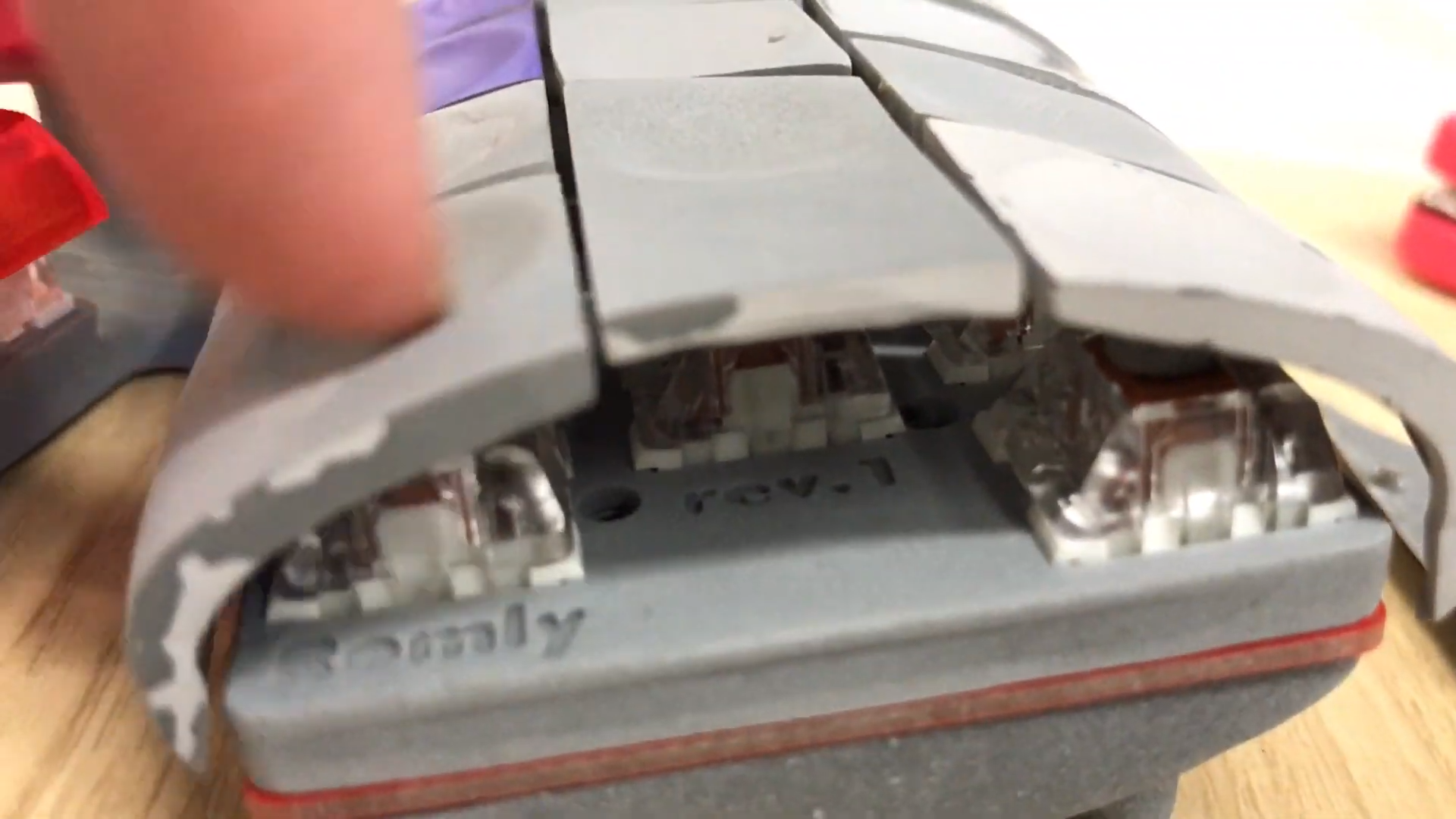 Speaking of [romly], one of their designs stands out as particularly unusual. There are a few things to note here. One is the very conspicuous surface profile of the (clearly totally custom) keycaps themselves. Instead of flat or cylindrical or spherical, these are round. Round like the outside of a log. If we didn’t know better it might look like the entire thing was sculpted or extruded as a single unit. And just below the deck are the perpendicular thumb clusters. Frankly we aren’t sure how to refer to this design feature. The switches are mounted at right angles facing inward so the user places a thumb inside it in a style reminiscent of the DataHand. It’s quite interesting, and we’d be love to know more about what specific functionality it provides.