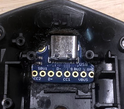Adding the USB-C connector ended up being quite a bit trickier. [cmot17] ordered a breakout board from Adafruit that was just a little too large to fit inside the mouse. In the end, not only did some of the case need to get cut away internally, but the breakout PCB itself got a considerable trimming. Once it was shoehorned in there, a healthy dose of hot glue was used to make sure nothing shifts around.