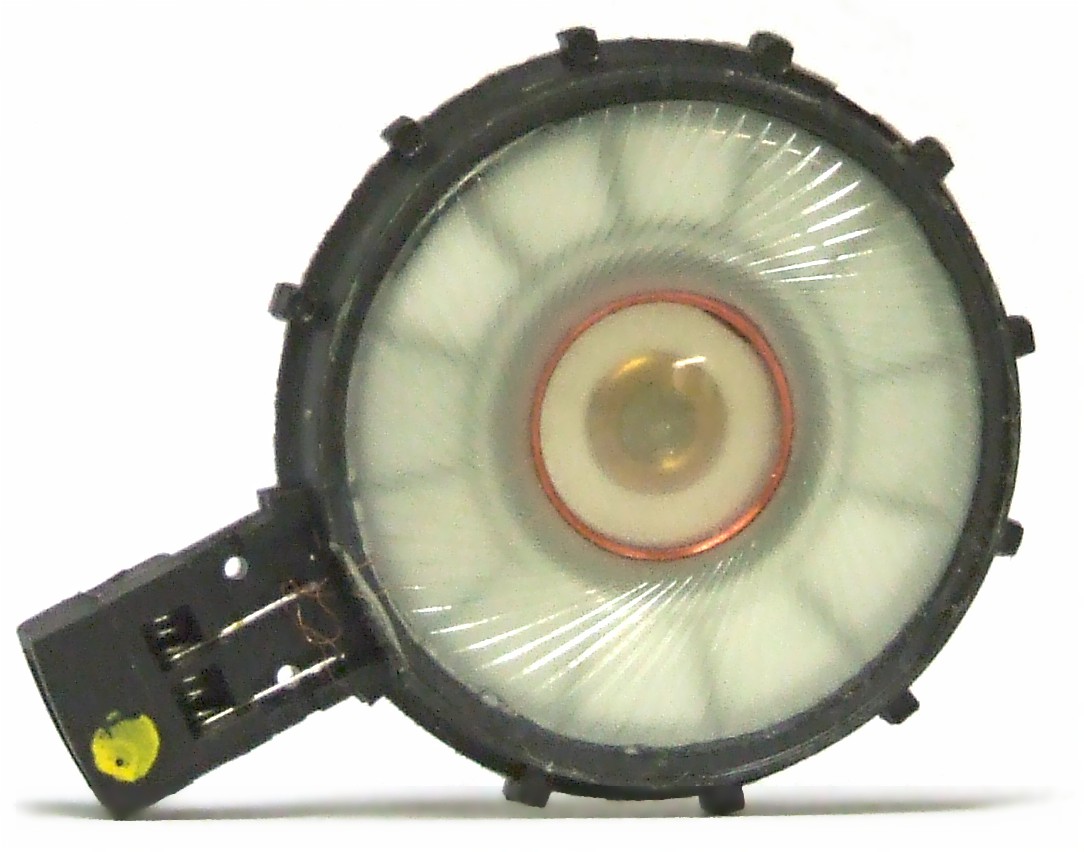 A typical modern headphone transducer, with a rare-earth magnet, and coil suspended on a polyester diaphragm. Iain Fergusson [CC BY 2.5]