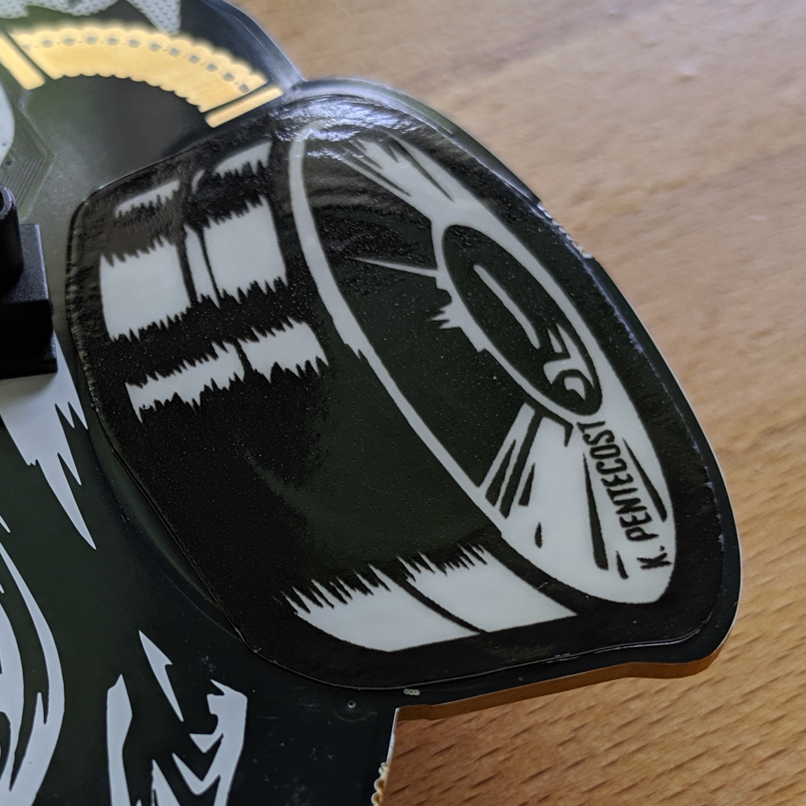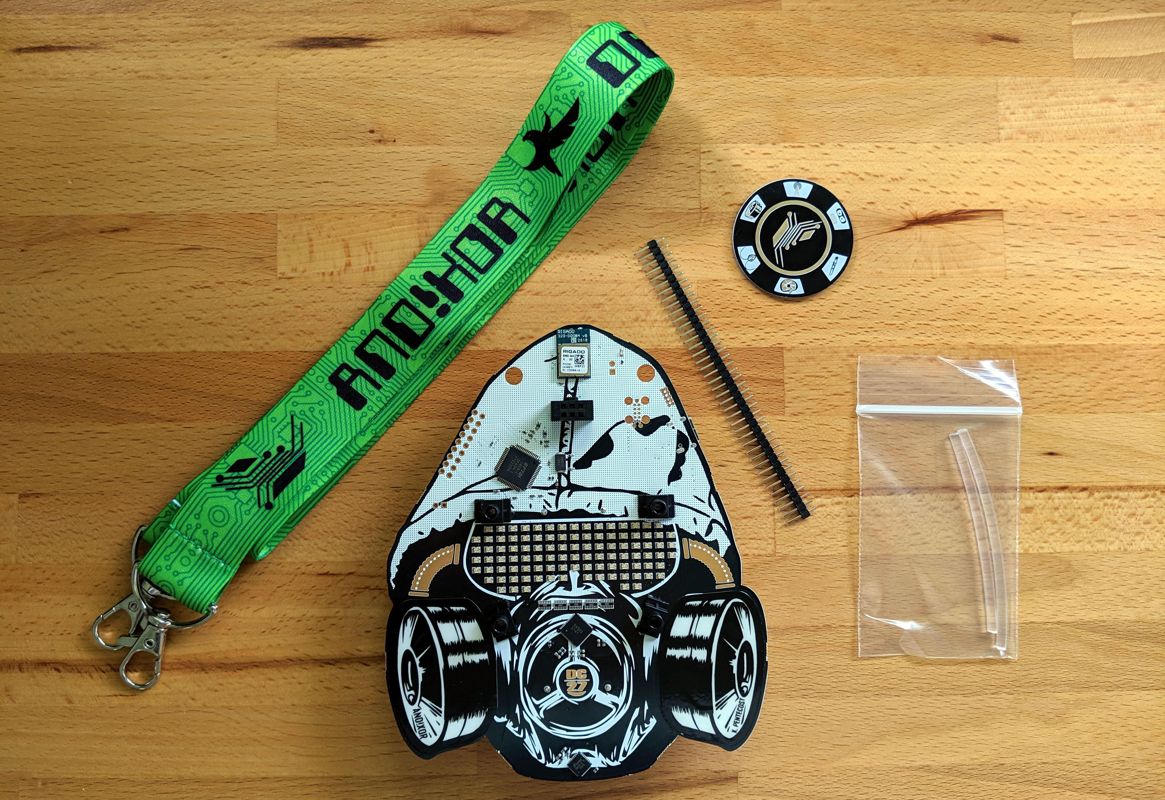 But look closely and you’ll see a new trick at work: stickers. The two canisters for the gas mask are stickers whose finish makes it easy to use the capacitive touch scroll wheels built into the board underneath. At the same time, this brings glow-in-the-dark phosphorescent material to the badge.