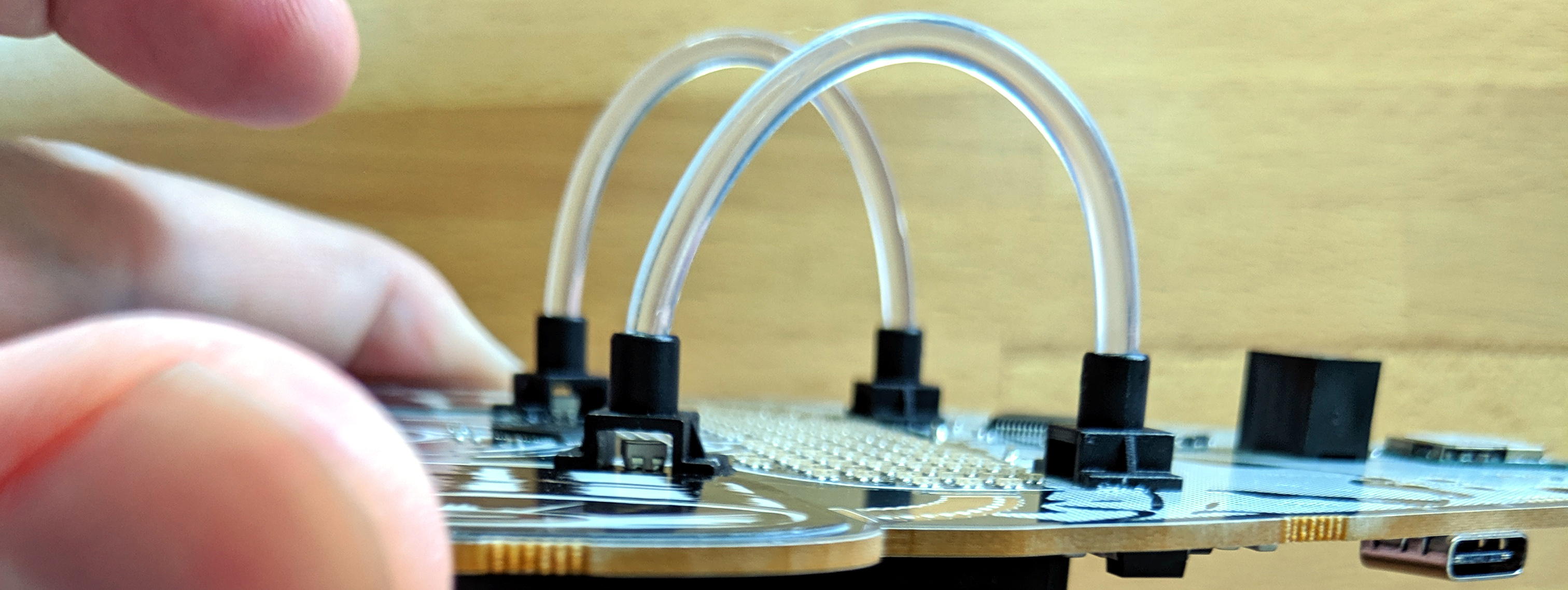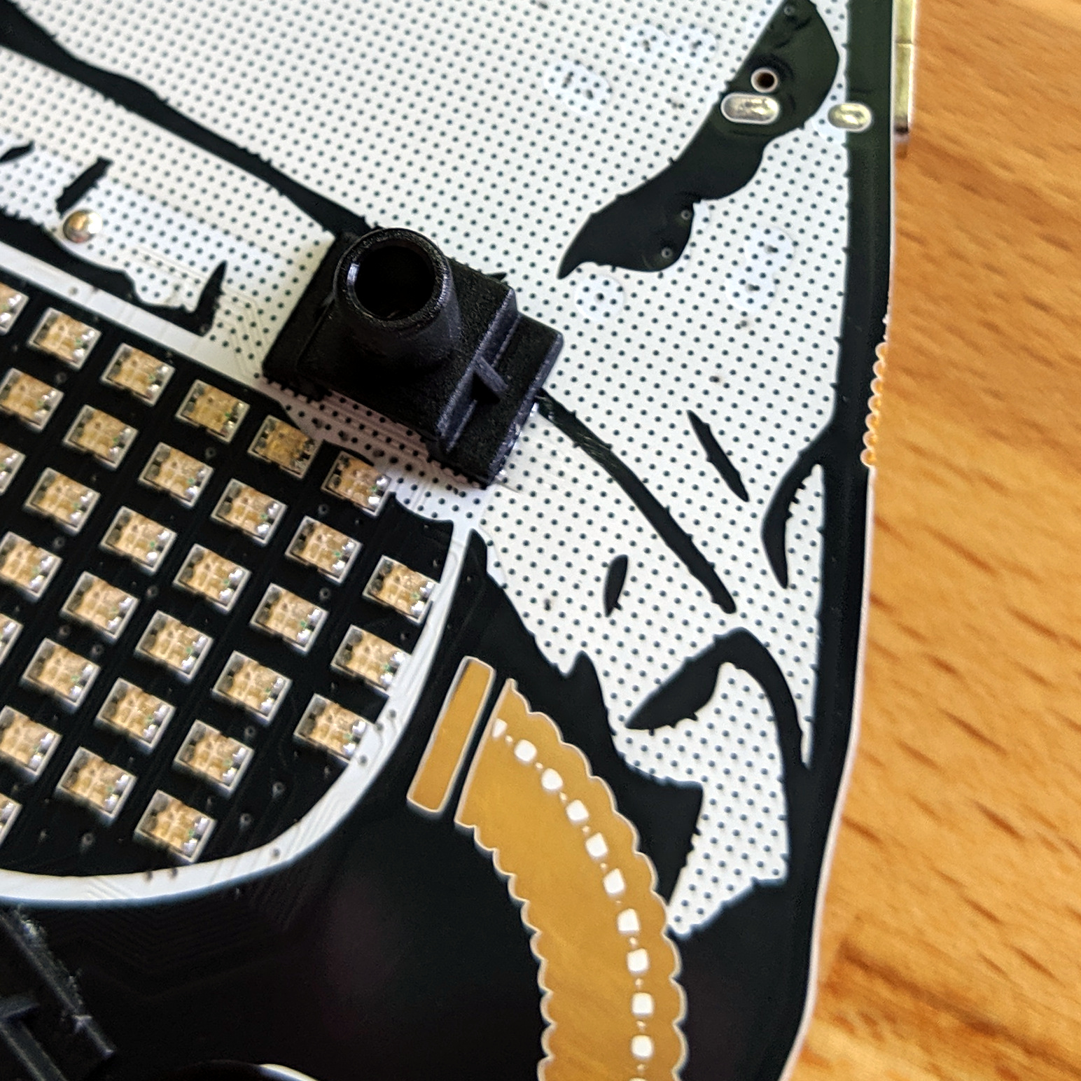 I’m not entirely sure what I think of the light pipes on this badge. It’s certainly a useful trick to keep in mind for future designs. The plastic receptacles snap onto the board through two small holes each. Straddling an RGB LED on the face of the board, these provide a fixture for the flexible light-pipe material. As you can see in the image a the top of the article, they do a good job of diffusing some light out of the sidewalls of the tube, and if you look into the end of the pipe, the light emission is very strong.