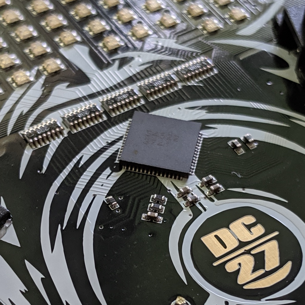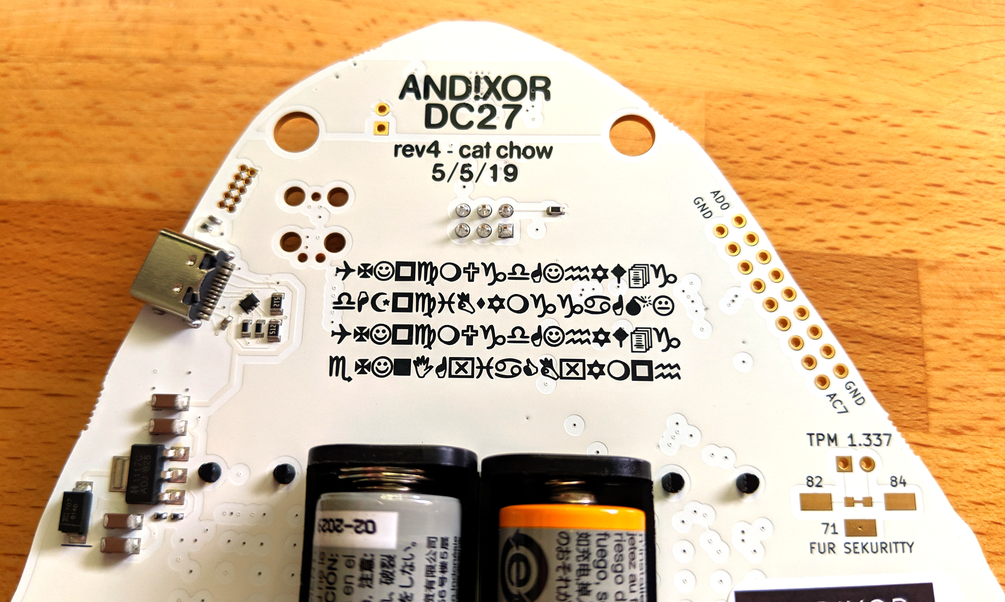 All past version of AND!XOR badges have included a screen, either OLED or LCD. This one moves away from that in favor of the RGB LED matrix. I most closely associate the goggle layout with the DC Furs badge from 2018. It was a great idea then and it’s a great idea now. Layout breaks up the monotony of a rectangle for an obvious reason, yet still allows scrolling characters as you would with a drab LED sign. Where you could have had a 7×17 matrix, you lose just 17 LEDs to the artistic shape for a total of 102 pixels. It’s the best of both worlds. I don’t miss screens at all here — how can a badge compete with what’s on your smartphone? This competes in a way no smartphone can begin to imagine.