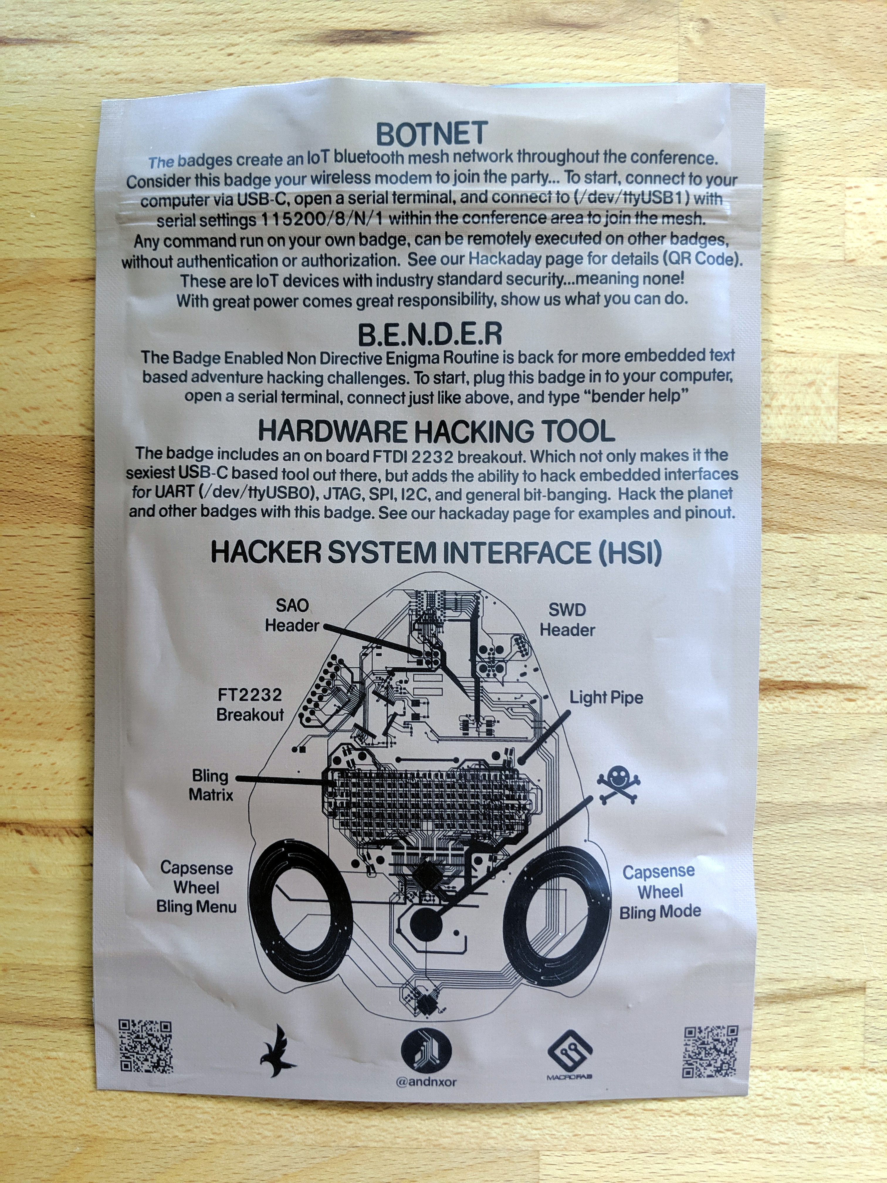 All-in-all this a lovely piece of hardware, but the real magic is in the entire package the AND!XOR team manages to pull together for this and every previous year of their adventures. I’m amazed by their creativity in packaging along — last year they shipped in burlap bags and this year you get a sleeve in the style of the US Military “Meal, Ready-to-Eat”. Every year there is new hardware involved that I hunger to see as soon as the badge comes out — last year I ogled the GreenPAK NVM and the ISSI driver, this year it’s the light pipes and the stickers. And the alternate-reality game is beyond compare — AND!XOR did such great work with the wireless protocols that they’ve been adopted by numerous other badge makers over the years to join the botnet game, and the text-based realm within the badge is delightful and deeply engaging.