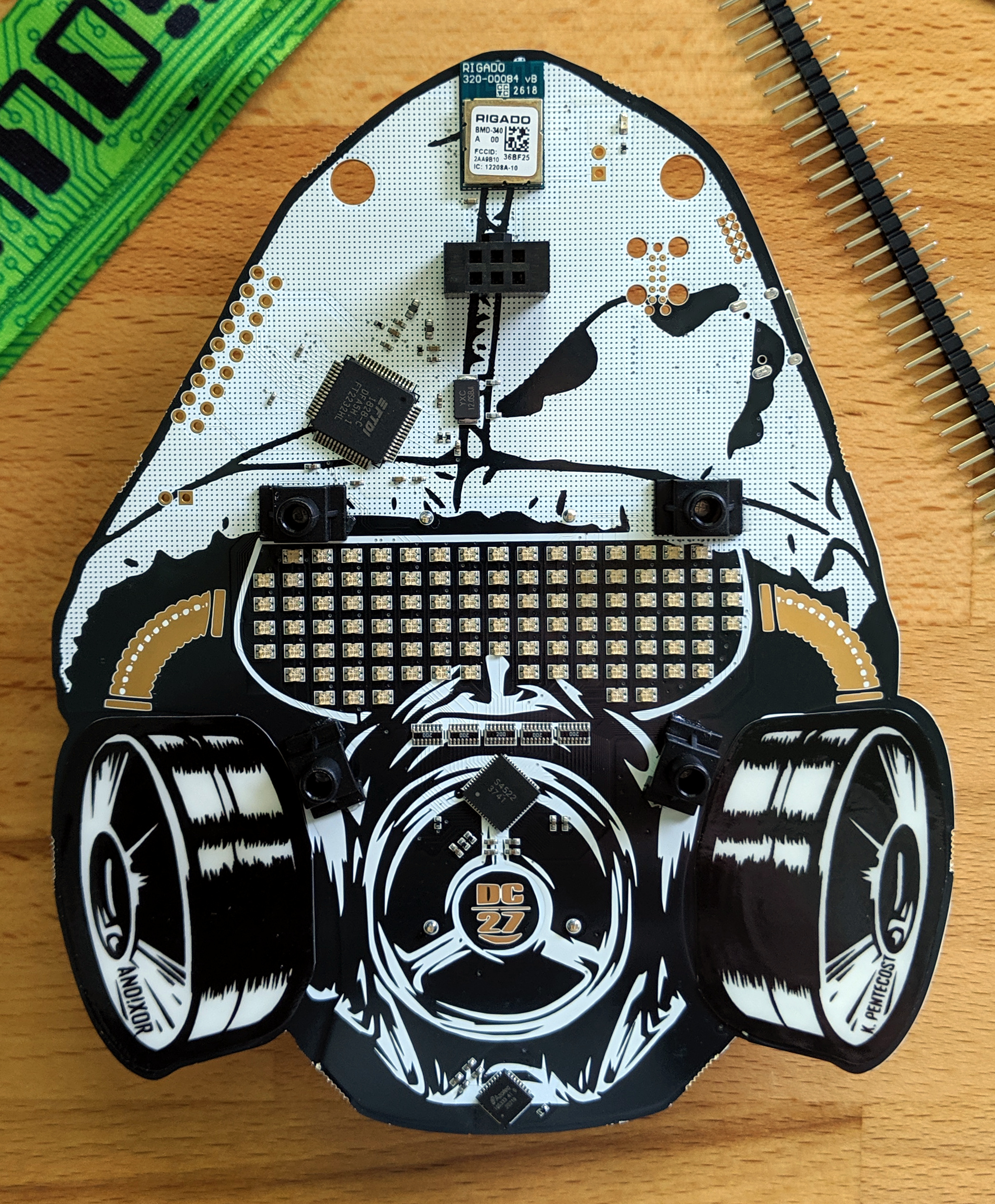 Yes, there’s a snappy RGB matrix in the shape of goggles, but it is the art and how it is treated on this board that really catches my eye. This badge looks fantastic even if it’s not switched on. The art is by Kevin Pentecost, a fan of the team who gave them the illustration during last year’s DEF CON.