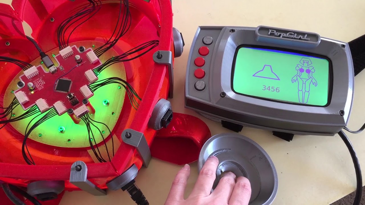 Her Beat Box augment links heartbeat to a speaker that can playback audio. It’s a feedback loop for arousal — one of the “extra credit” goals she set for the project. The Propeller Pasties sense breast arousal with IR distance sensors and use propellers that spin as an external indicator. Spinning planetary gears were inspired by a toy and make granular speed control much easier. For control she has the wrist-mounted Pop Girl user interface — a nod to Fallout’s Pip Boy — that uses a Raspberry Pi and touchscreen inside a 3D printed enclosure. The Hot Spot augment is a temperature triggered buttocks winch that raises a particularly difficult challenge: how do you mount things to a living body and how do you ensure you don’t injure yourself in the process?