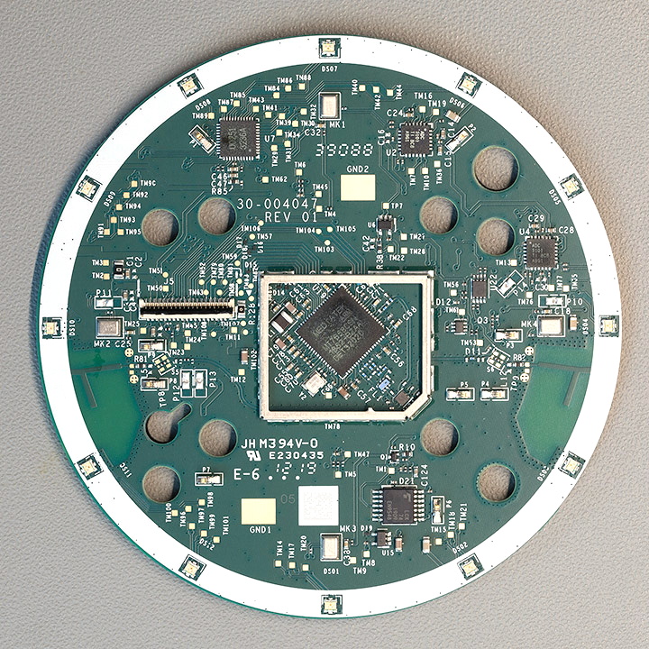 The Echo Dot is powered by a quad-core Mediatek MT8516BAAA 64-bit ARM Cortex-A35 processor and the OS lives on an 8GB Samsung KMFN60012M-B214 eMMC. A pair of Texas Instruments LV320ADC3101 DACs are used to process the incoming audio from the four microphones arranged around the edge of the PCB, and [Brian] says there appears to be a Fairchild 74LCX74 flip-flop in place to cut the audio feed when the user wants a bit of privacy.