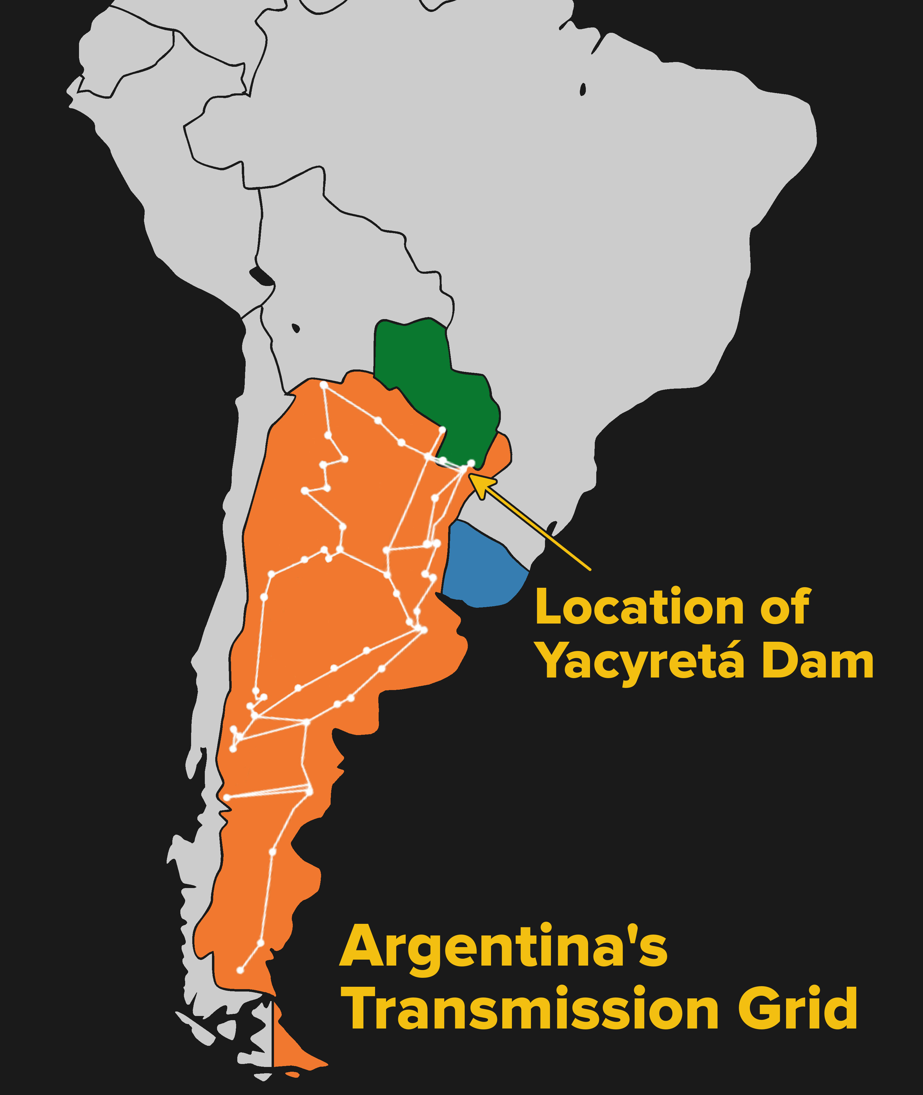 Initial reports on June 17th cite vague, nondescript possible causes but seem to focus on transmission lines connecting population centers with the hydroelectric power plant at Yacyretá Dam on the border of Argentina and Paraguay, as well as some ongoing issues with the power grid itself. Problems with the transmission line system caused this power generation facility to become separated from the rest of the grid, which seems to have cascaded to a massive power failure. One positive note was that the power was restored in less than a day, suggesting at least that the cause of the blackout was not physical damage to the grid. (Presumably major physical damage would take longer to repair.) Officials also downplayed the possibility of cyber attack, which is in line with the short length of time that the blackout lasted as well, although not completely out of the realm of possibility.