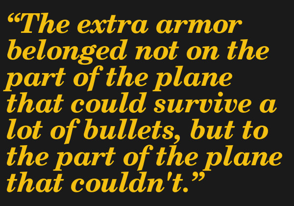 Wald had a different point of view. Instead of putting armor on the fuselage, Wald wanted to add armor to the engines, even though they appeared to be taking fewer hits. Why? Because the samples the Army measured were from planes that returned. Wald surmised that the planes with many bullet holes to the engines were not coming home. The extra armor belonged not on the part of the plane that could survive a lot of bullets, but to the part of the plane that couldn’t.