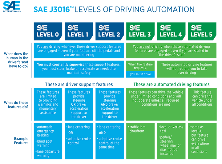 SAE “Levels of Driving Autonomy.” PlatoonPro is a Level 1 system, while automated following qualifies as Level 4. Click to enlarge. Source: SAE International