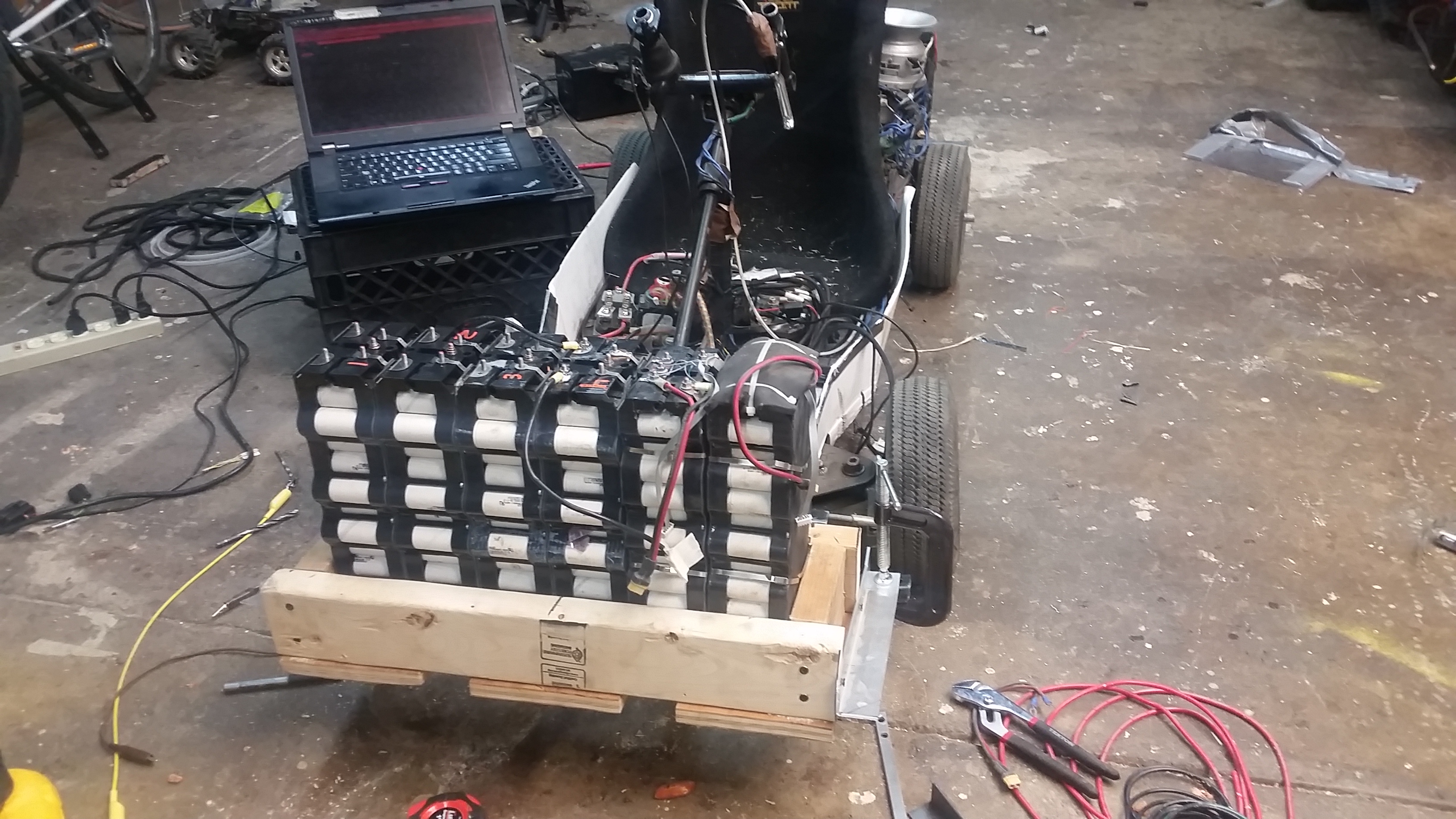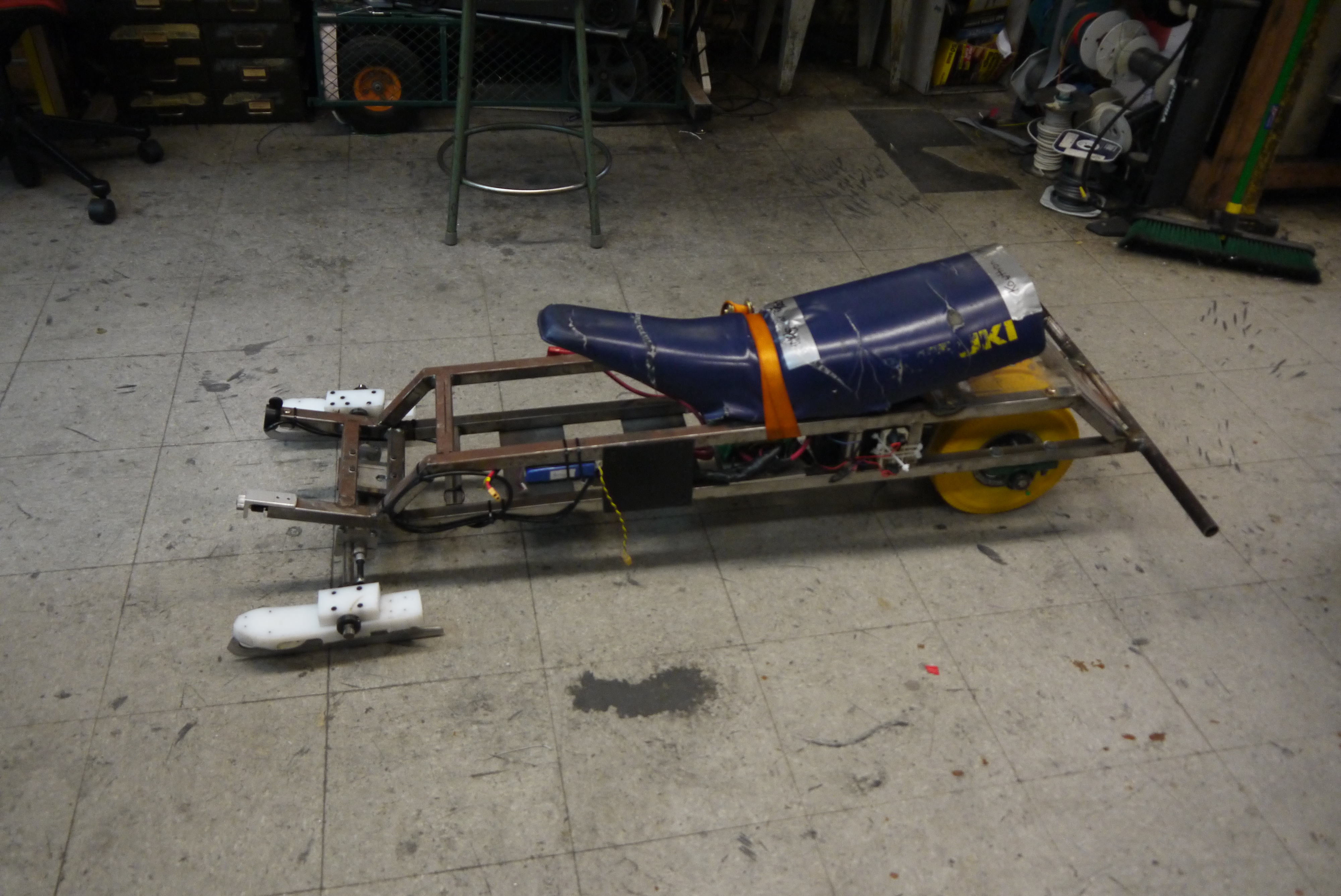 The crew fitted a seat from a longscooter and made a chain guard from aluminum u-channel to keep the flying chain away from the driver’s fingers. The final user interface includes a right-hand throttle and a left-hand “electric brake” (using resistors to remove the stored energy quickly to combat the enormous inertia produced by the vehicle).