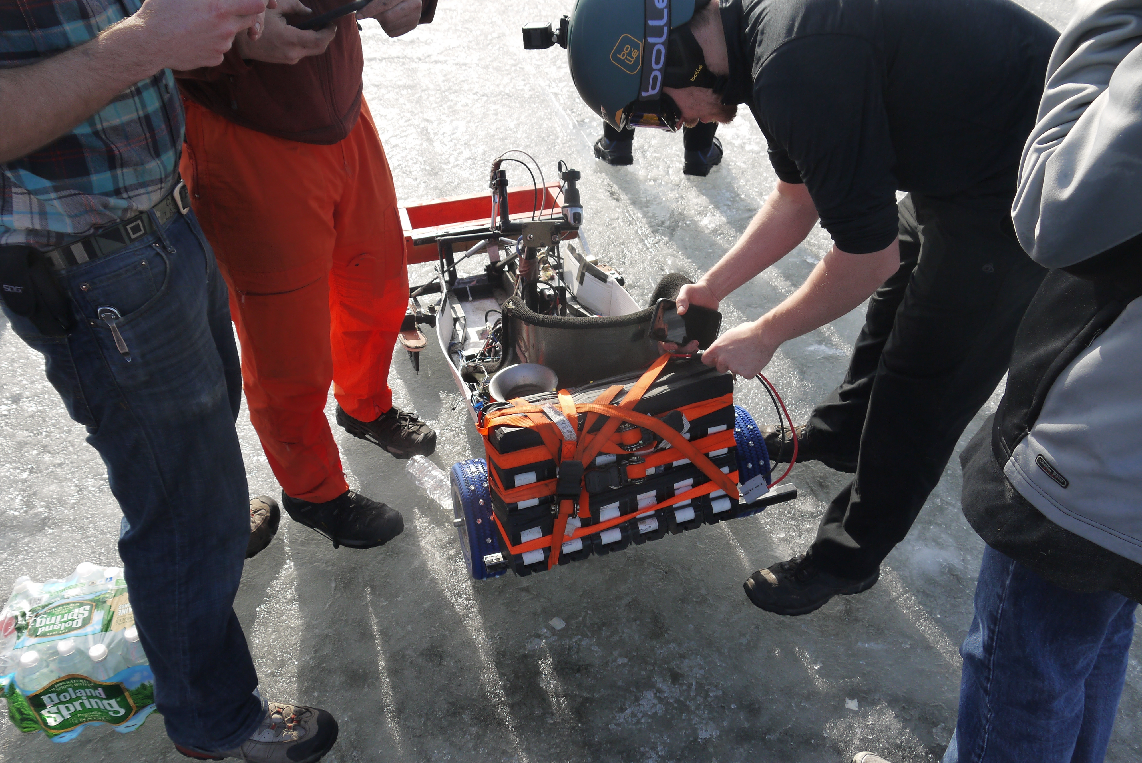 The battery is ratchet strapped to the back of the Atomic Thing to provide more traction on the ice. It must feel just like riding on top of a different kind of rocket.
