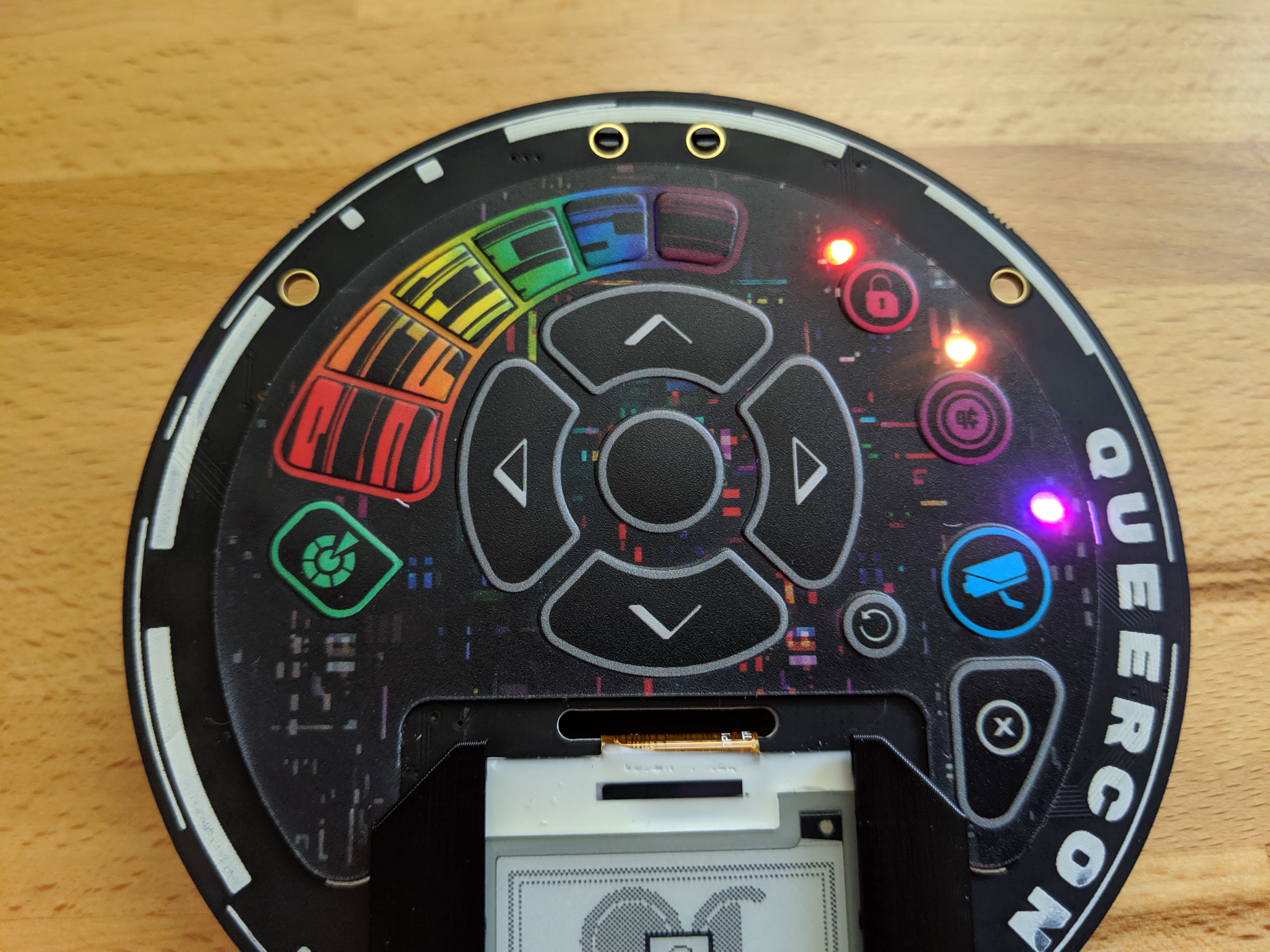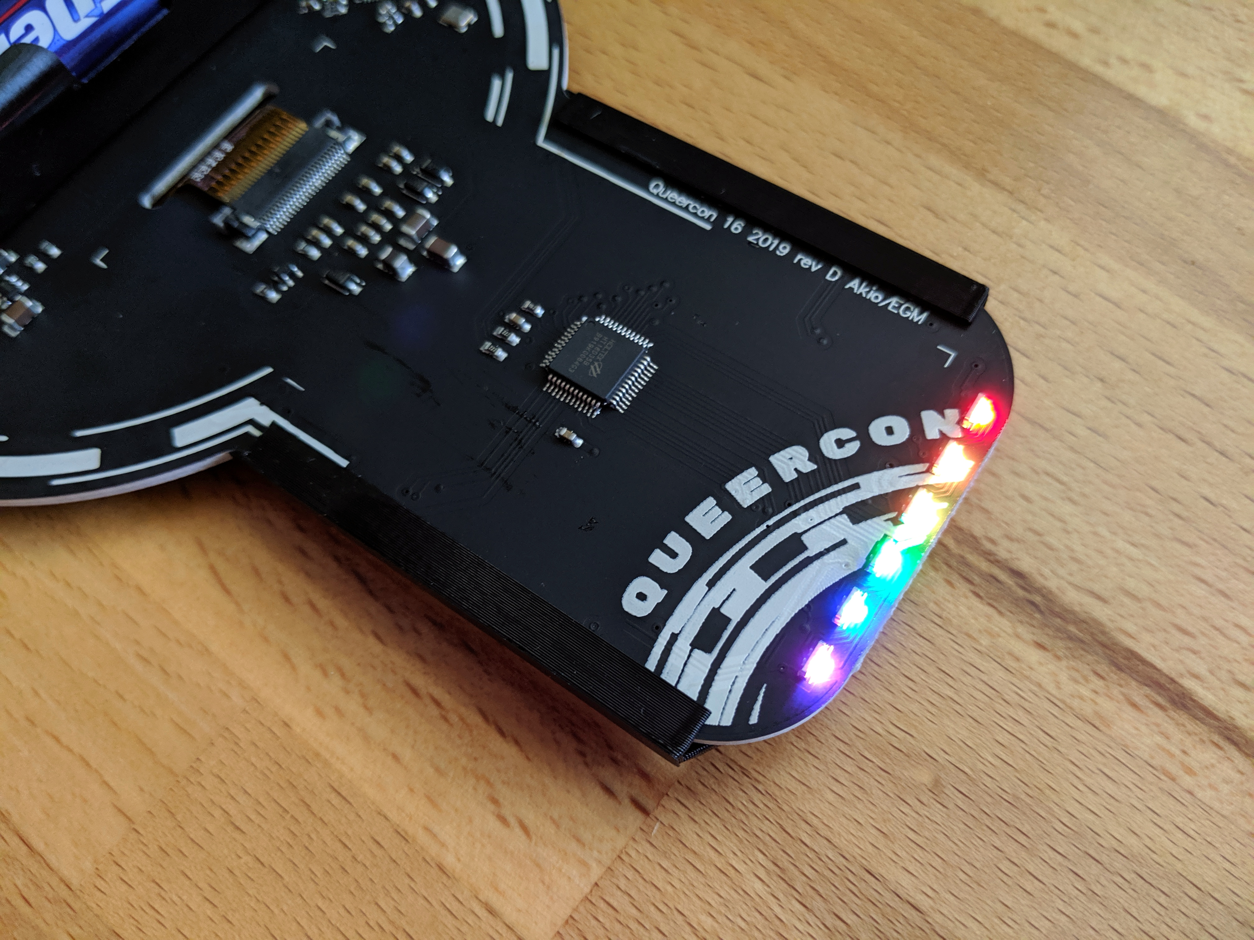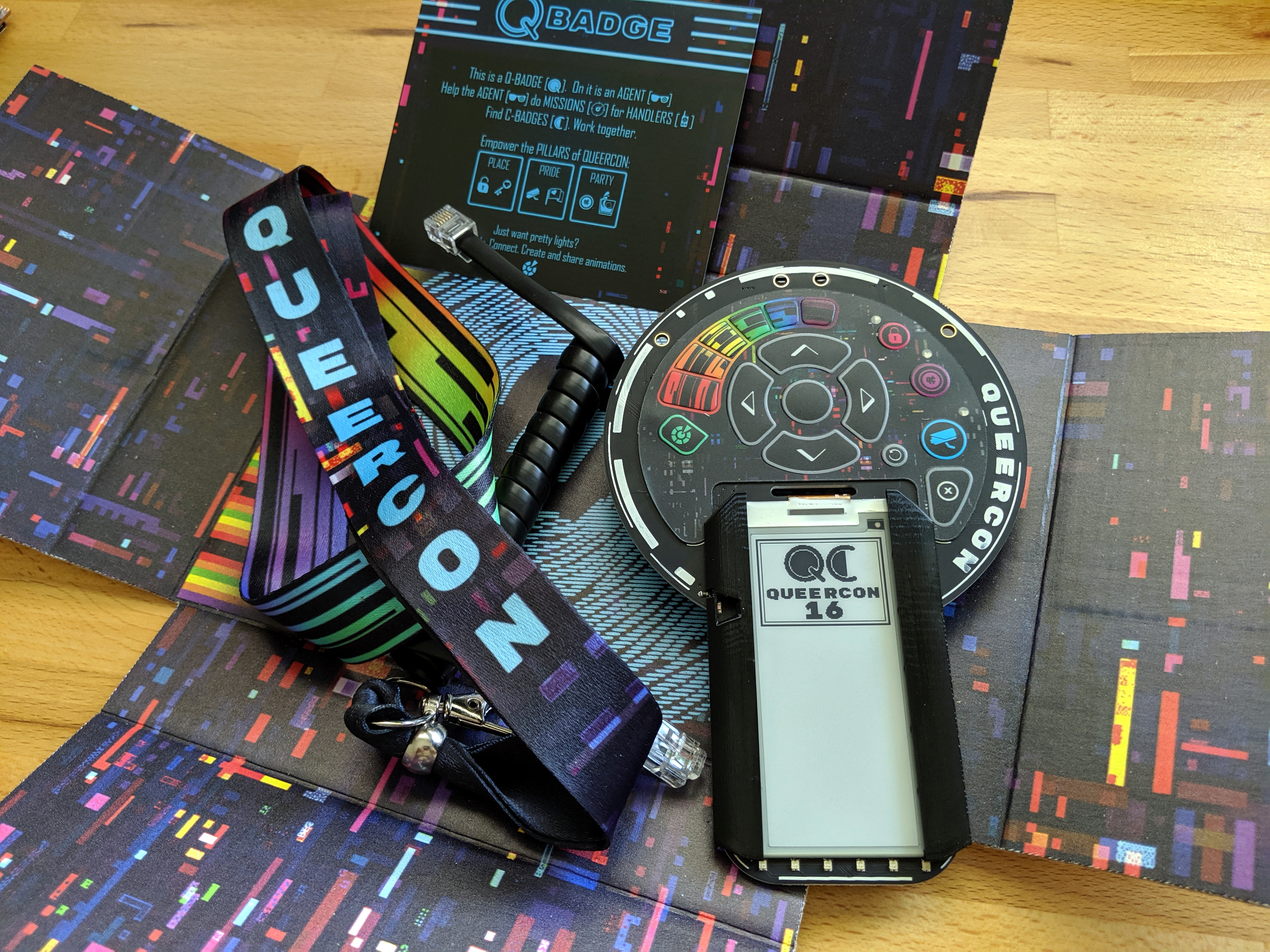 This year, there are two hardware badges produced by the team composed of Evan Mackay, George Louthan, and Subterfuge. The one shown here is nicknamed the “Q” badge for its resemblance to the letter. Both get you into the conference, both are electronically interactive, but this one is like a control panel for an alternate reality game (ARG) that encourages interactivity and meaningful conversations. The other badge is the “C” badge. It’s more passive, yet acts as a key in the ARG — you cannot progress by interacting with only one type of badge, you must work with people sporting both badge types so that Queercon attendees who didn’t purchase the Q badge still get in on the fun.