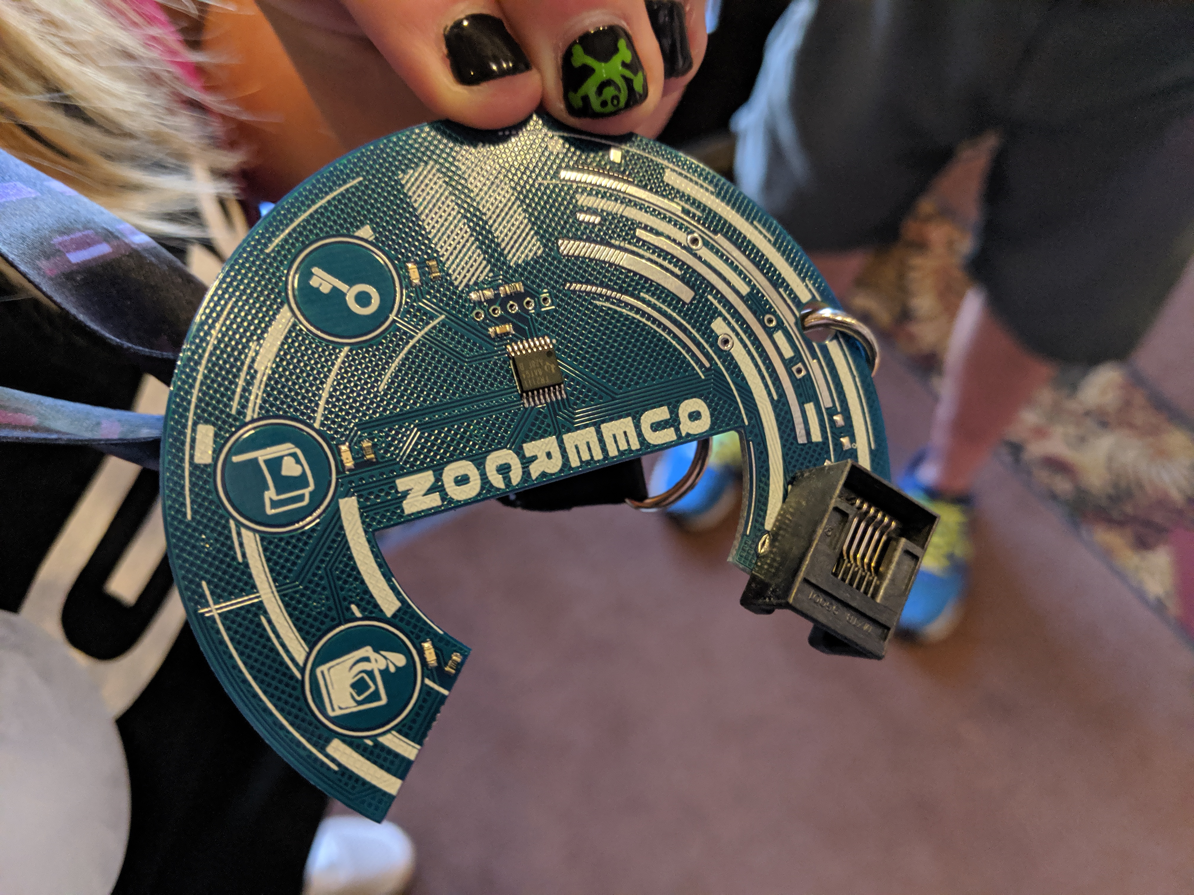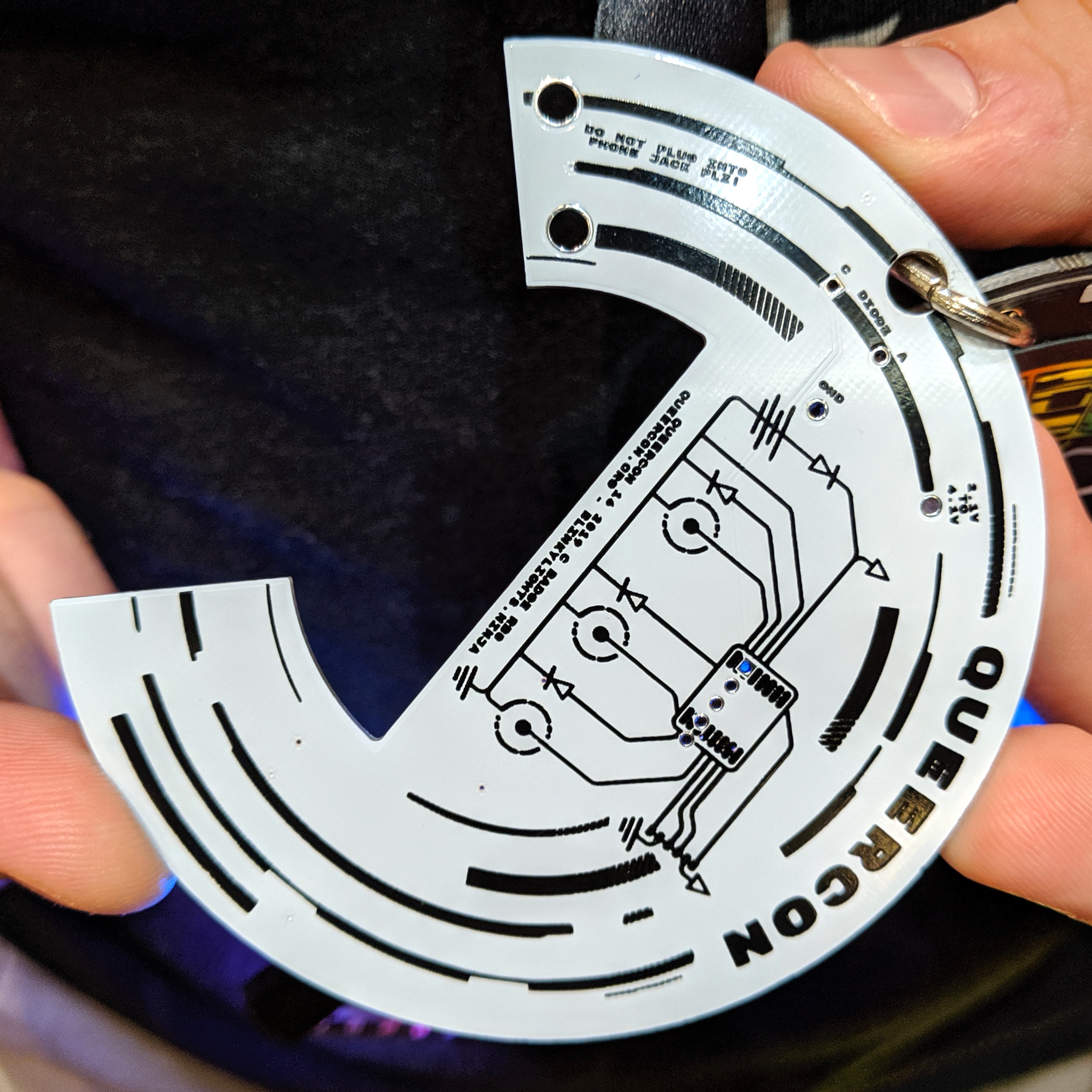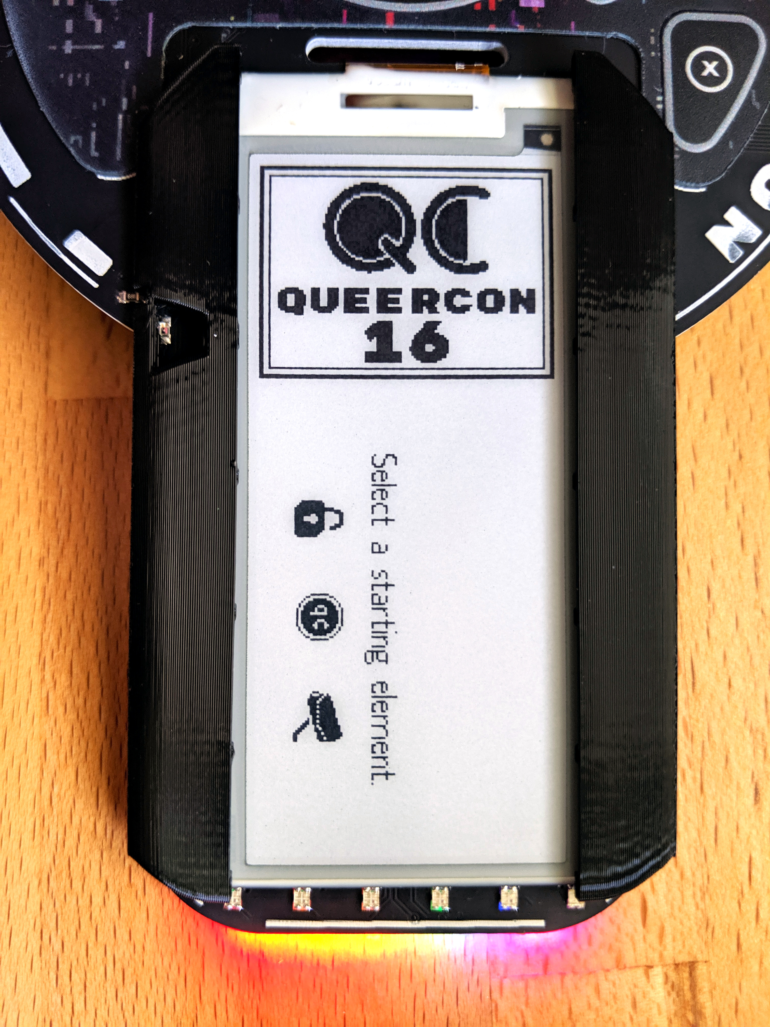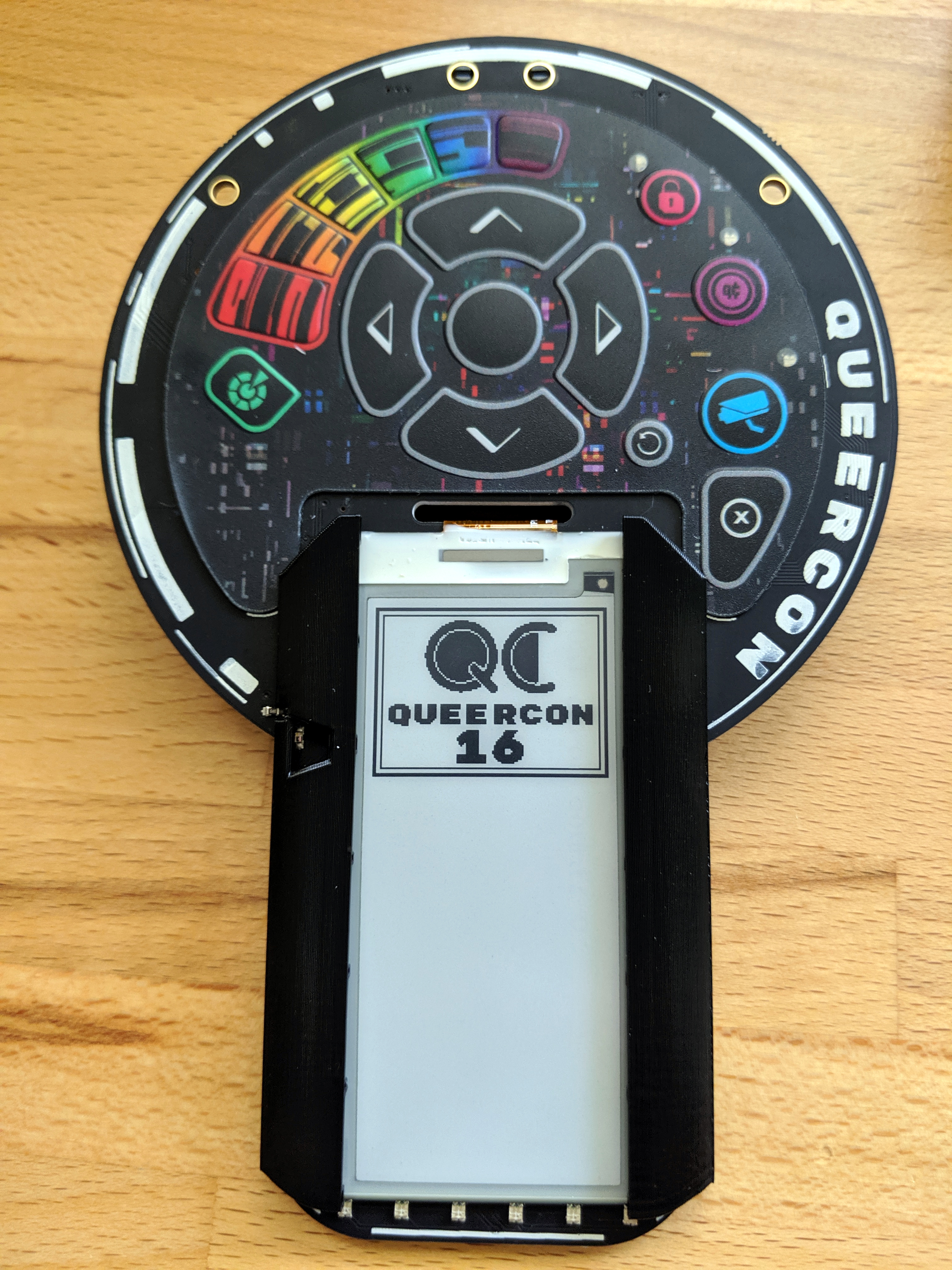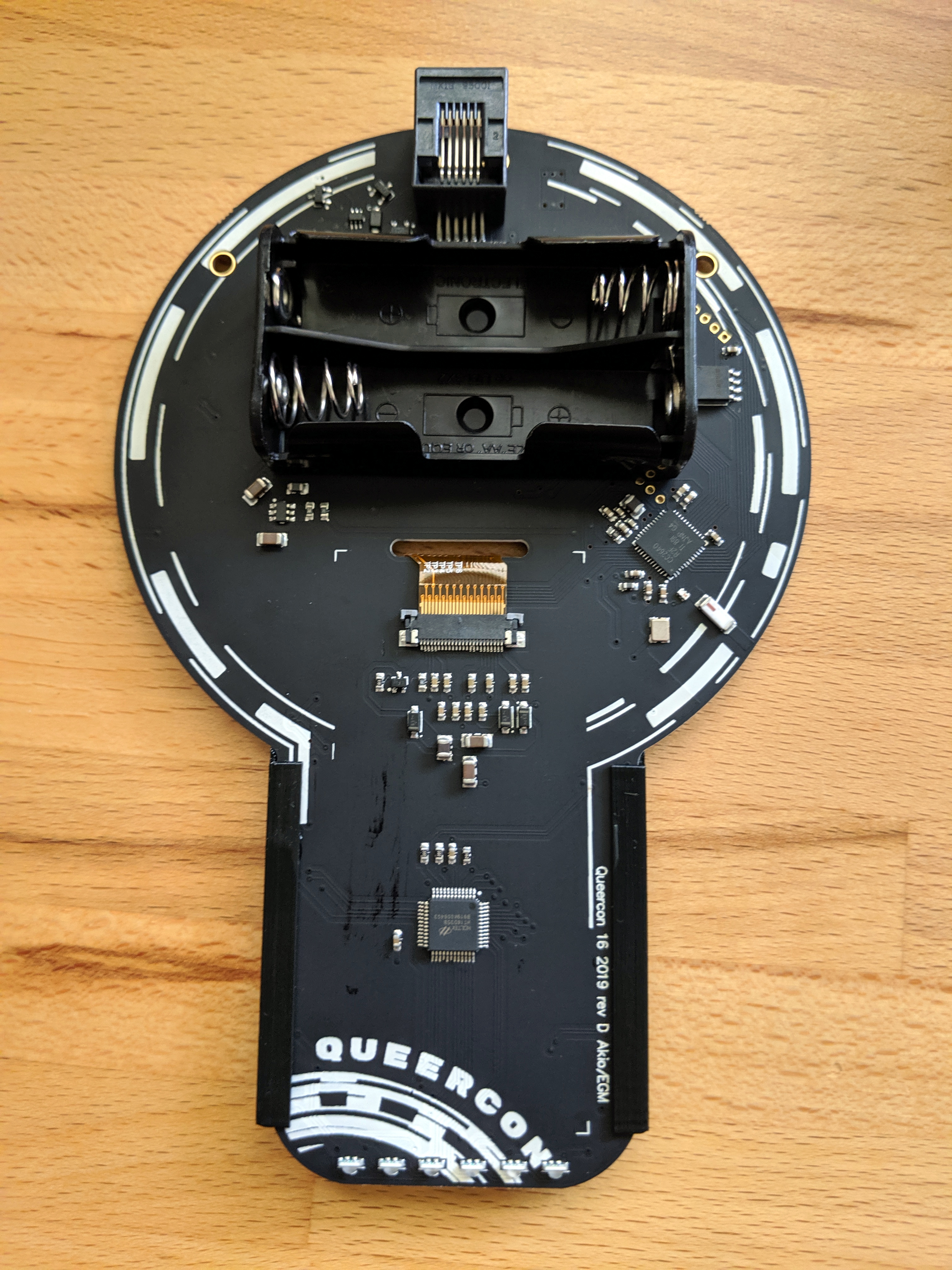 This is the C badge available to all Queercon attendees who chose not to purchase the Q badge. The Crew badge pictured here is unpopulated, but on the attendee version you can see a jack that looks like Ethernet or telephone. It is neither, and I’m amused by the silk screen on the back that reads “DO NOT PLUG INTO PHONE JACK PLZ!”. It’s an RJ12 6P6C connector that works with the cable provided with each Q badge. It is the method for connecting between badges to further the ARG.