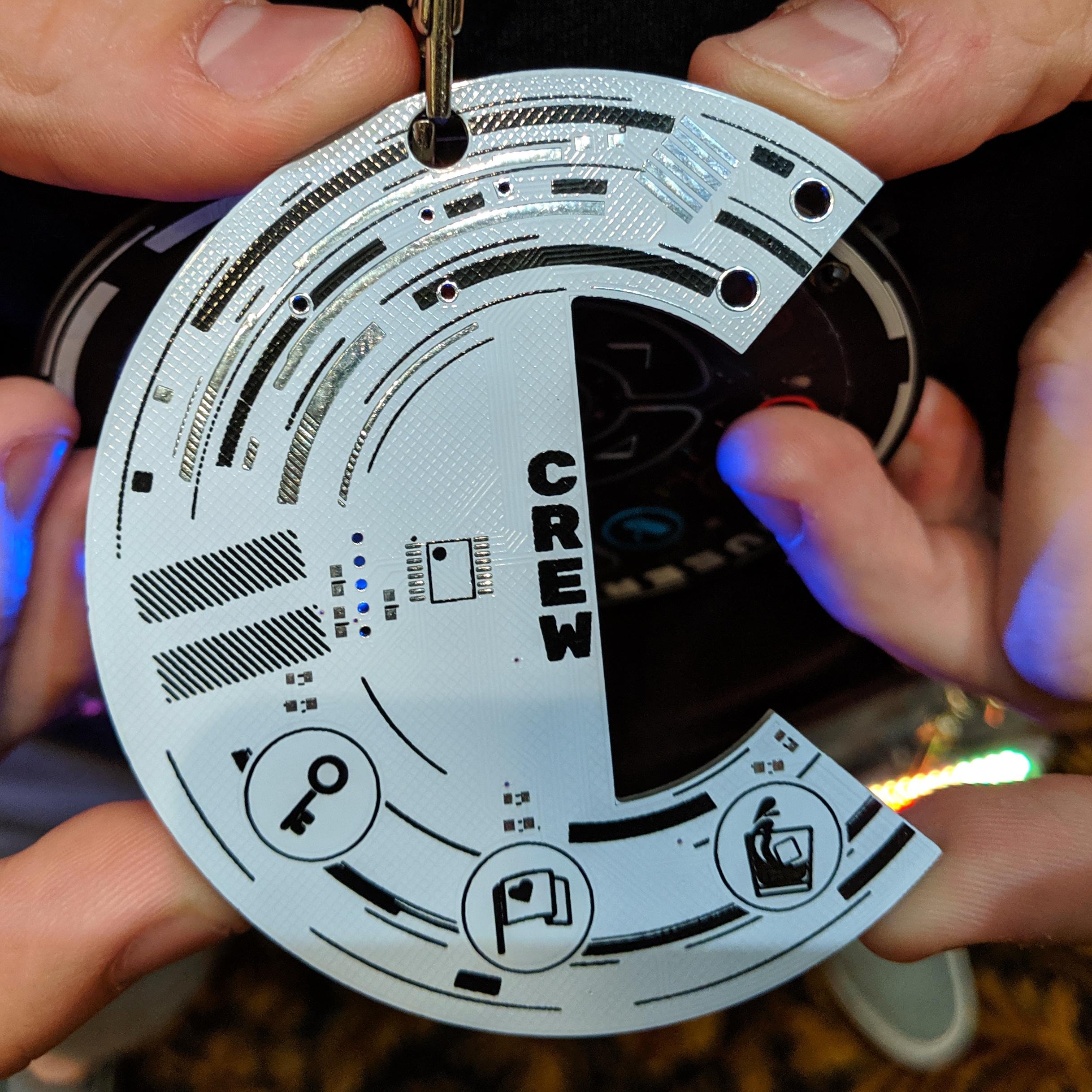 At first glance it’s easy to miss how special that keyboard is. It takes up the circular area on the face of the badge and three things catch my eye, challenging what I thought these membrane keyboards could be. First, the full-color printing and surface finish are both incredibly well-done. Second, this is not a boring key layout (okay, the direction keys are slightly boring) but one custom tailored to the ARG. And finally, there are LEDs lurking behind this keyboard!