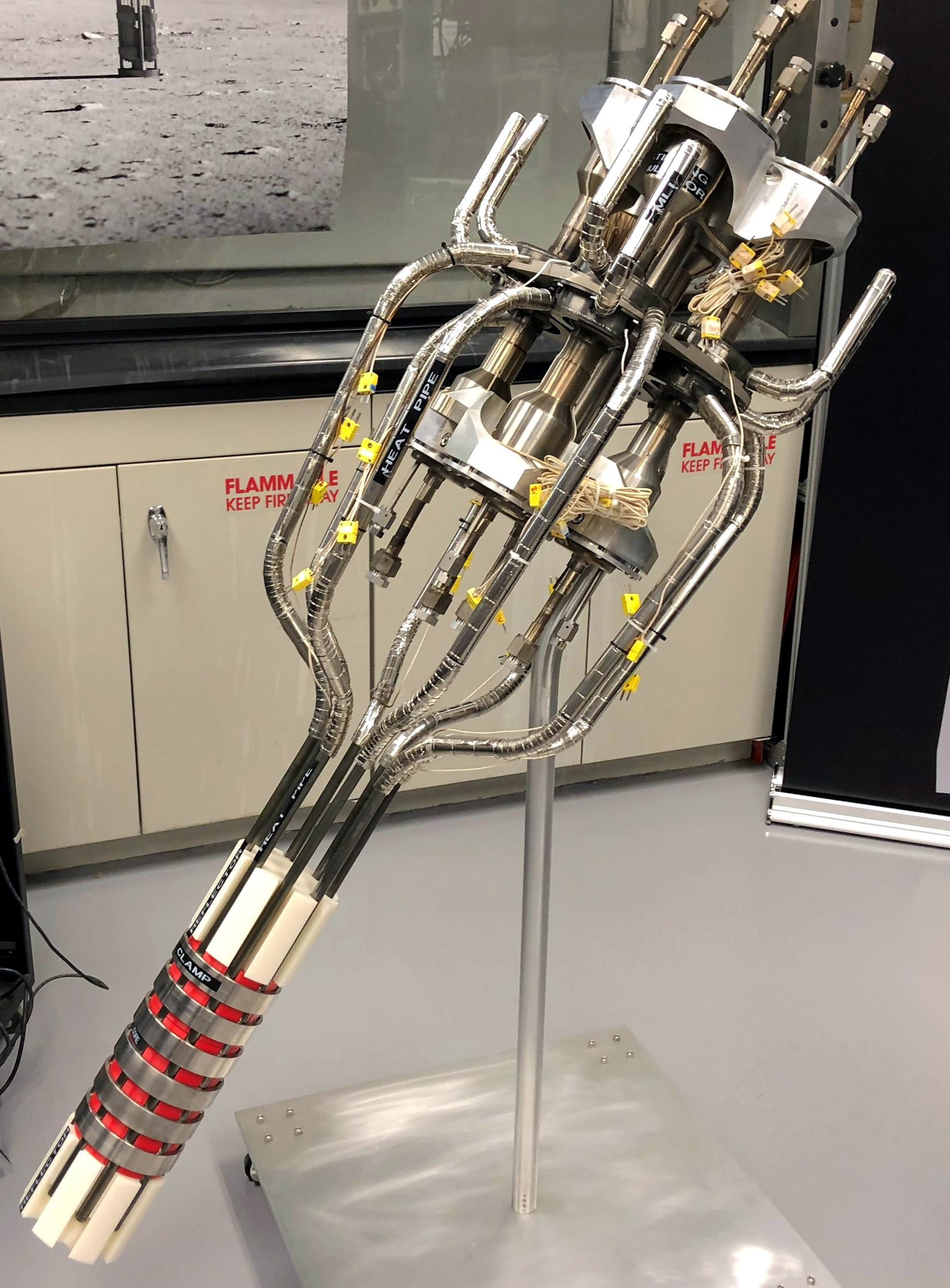 A single boron carbide control rod in the center of the core is used to control the rate of fission, which in turn can be used to adjust its heat output. When launched, the core would be in a “cold” state, where the control rod is fully inserted and no fission is taking place. Launching in an inert state means that the nuclear fuel won’t be consumed until the reactor is actually ready to be used at the destination location, further extending its useful lifespan. Once the Kilopower touches down on the Moon or Mars, the control rod will be removed and the nuclear reaction will begin.