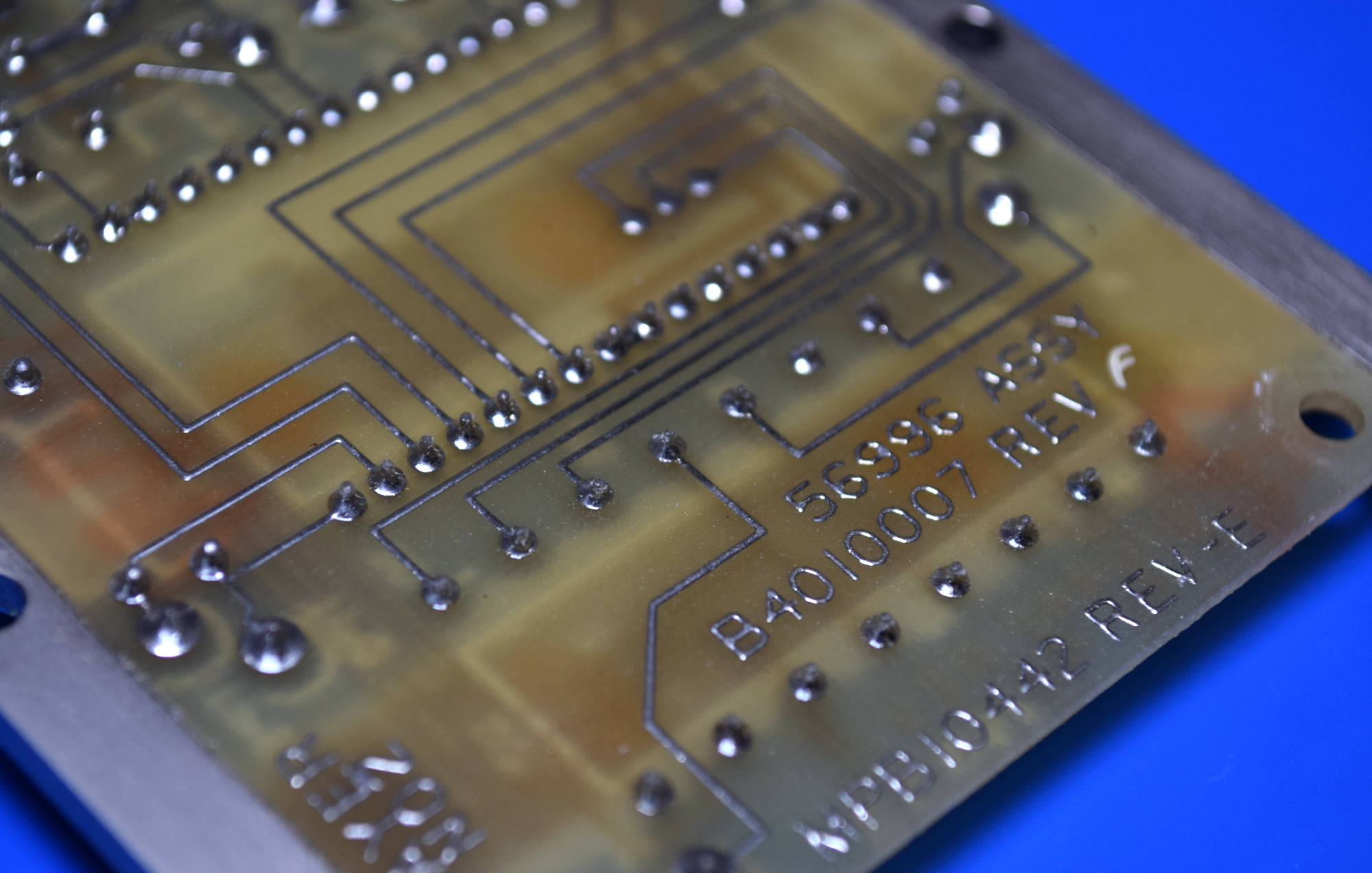 When I finally cracked the seal on the ID-2124 case and lifted the cover, I’ll admit an audible gasp might have snuck out. The board is absolutely gorgeous, and between the conformal coating and the fact it’s spent the last 30-odd years in a hermetically sealed box, it’s in pristine condition. It was literally like opening up an electronics time capsule. Although from when might be debatable; while the date codes on various components point to it being manufactured around 1987, the overall design looks closer to something from late 1970s.