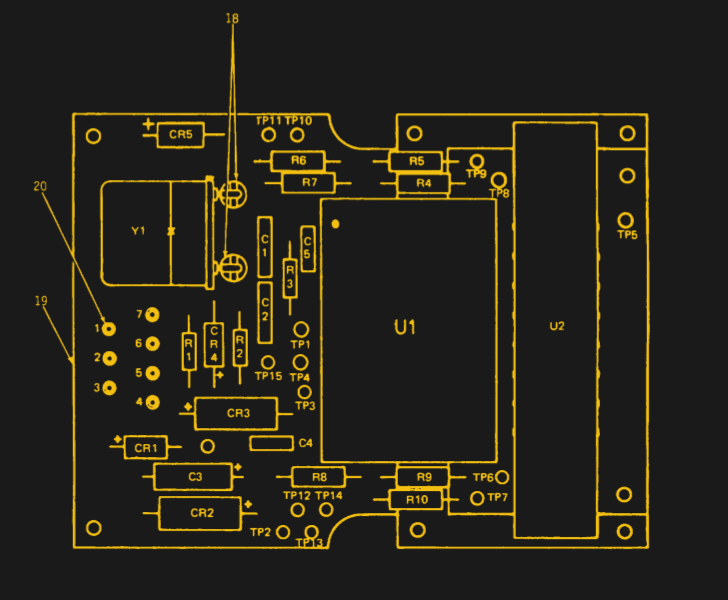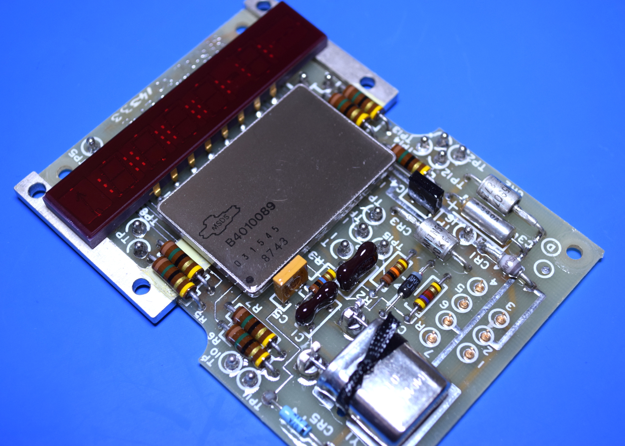 Chief among them is, unquestionably, the huge device in the middle labeled B4010089. It’s clearly a microcontroller of some type (to use the modern parlance), but I’ve been unable to find any information on it. In the diagrams I’ve found, the device is simply referred to as “LOGIC AND DISPLAY”, which seems to indicate there’s a display driver living inside that sealed metal package as well. Also note that it and the two resistors on either side have been attached to the metal bar with what appears to be a thermally conductive material. It’s probably safe to assume that this component gets rather warm during operation.