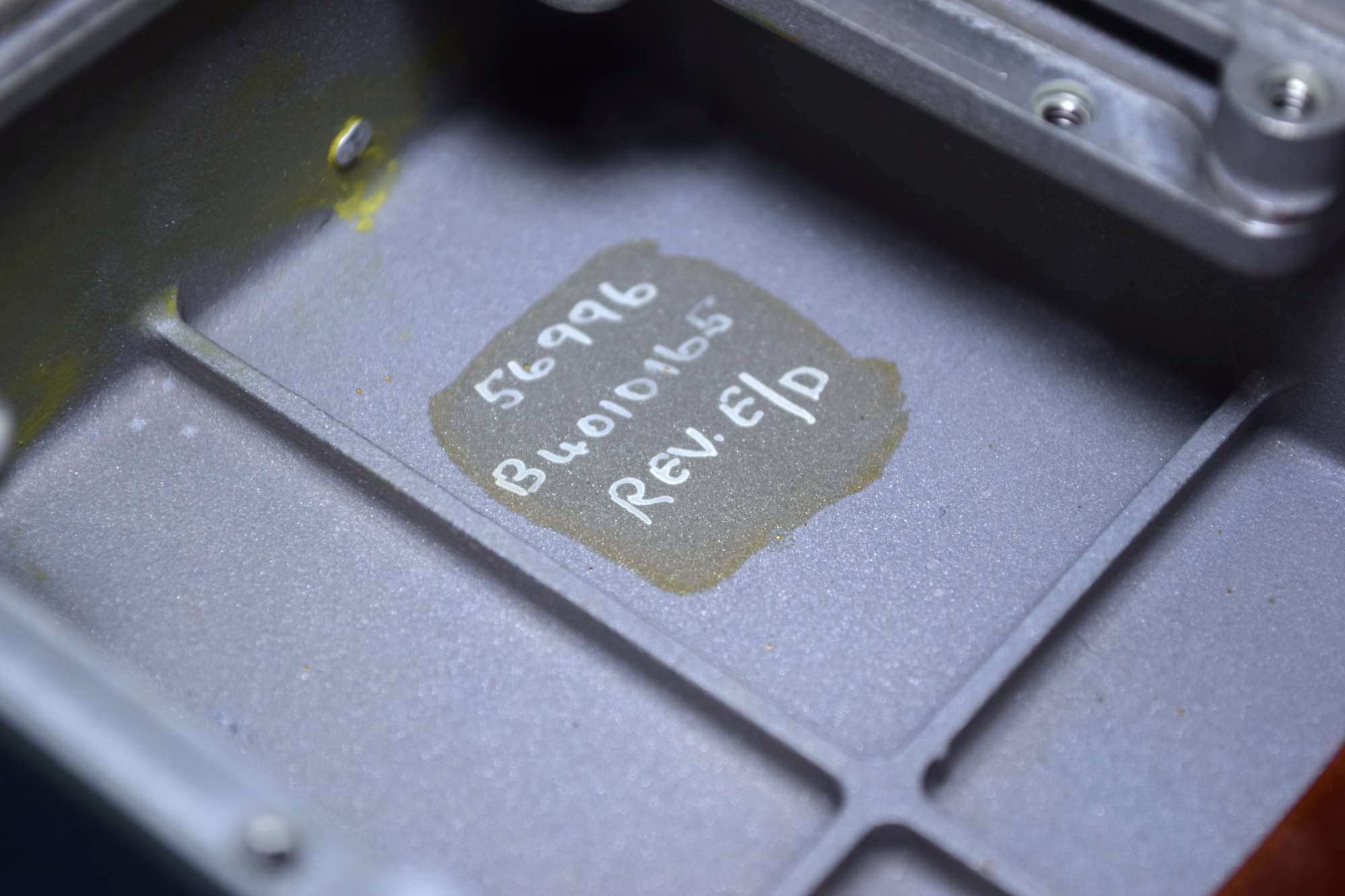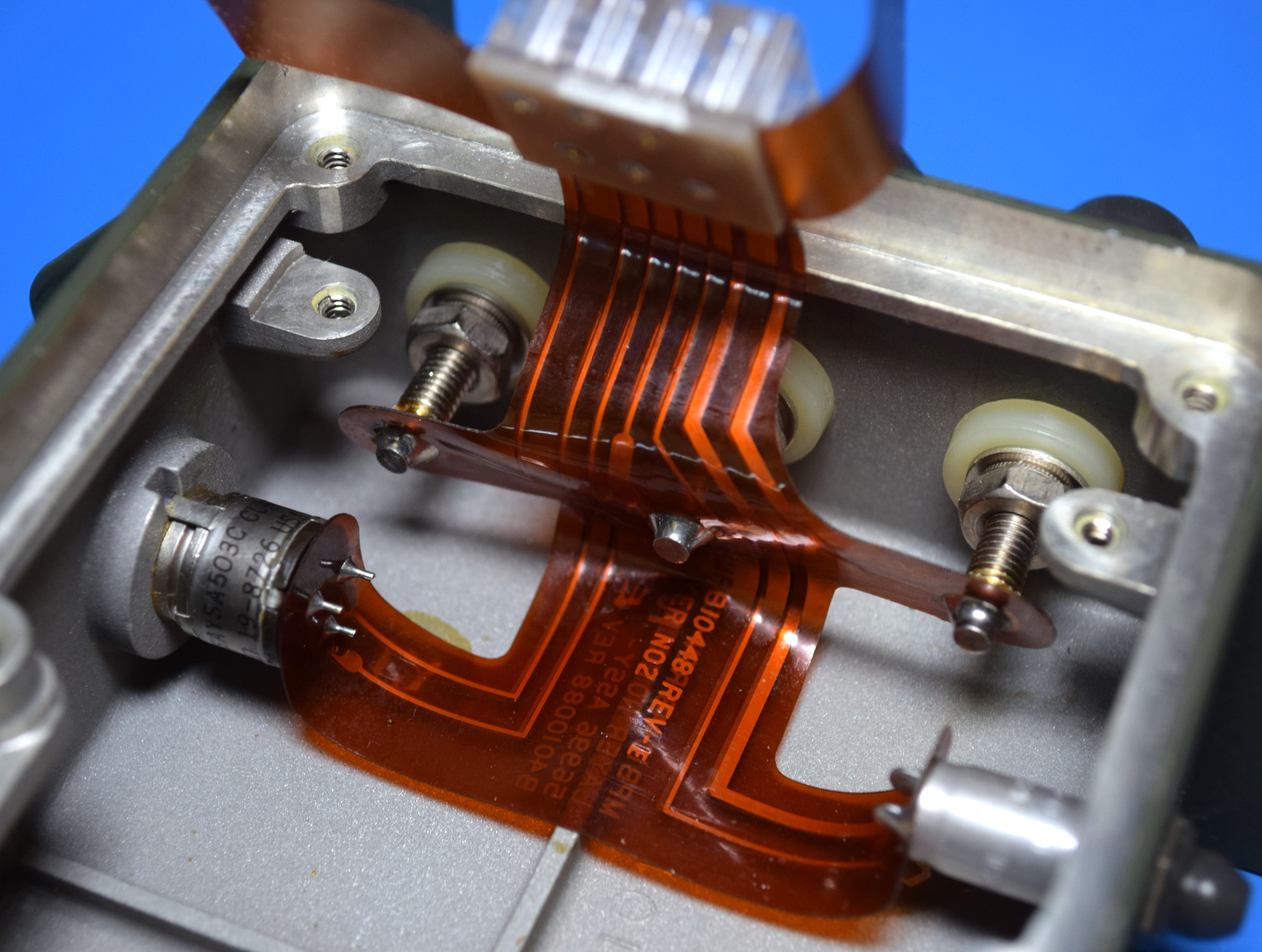 With the PCB removed, we can see the only components below it are the controls and wiring lugs, which are connected via a flexible flat cable terminated with a delightfully chunky plug. There’s also a handwritten notation that lists the Federal Supply Code for Manufacturer (FSCM), the part number for the case itself, and the current design revision.
