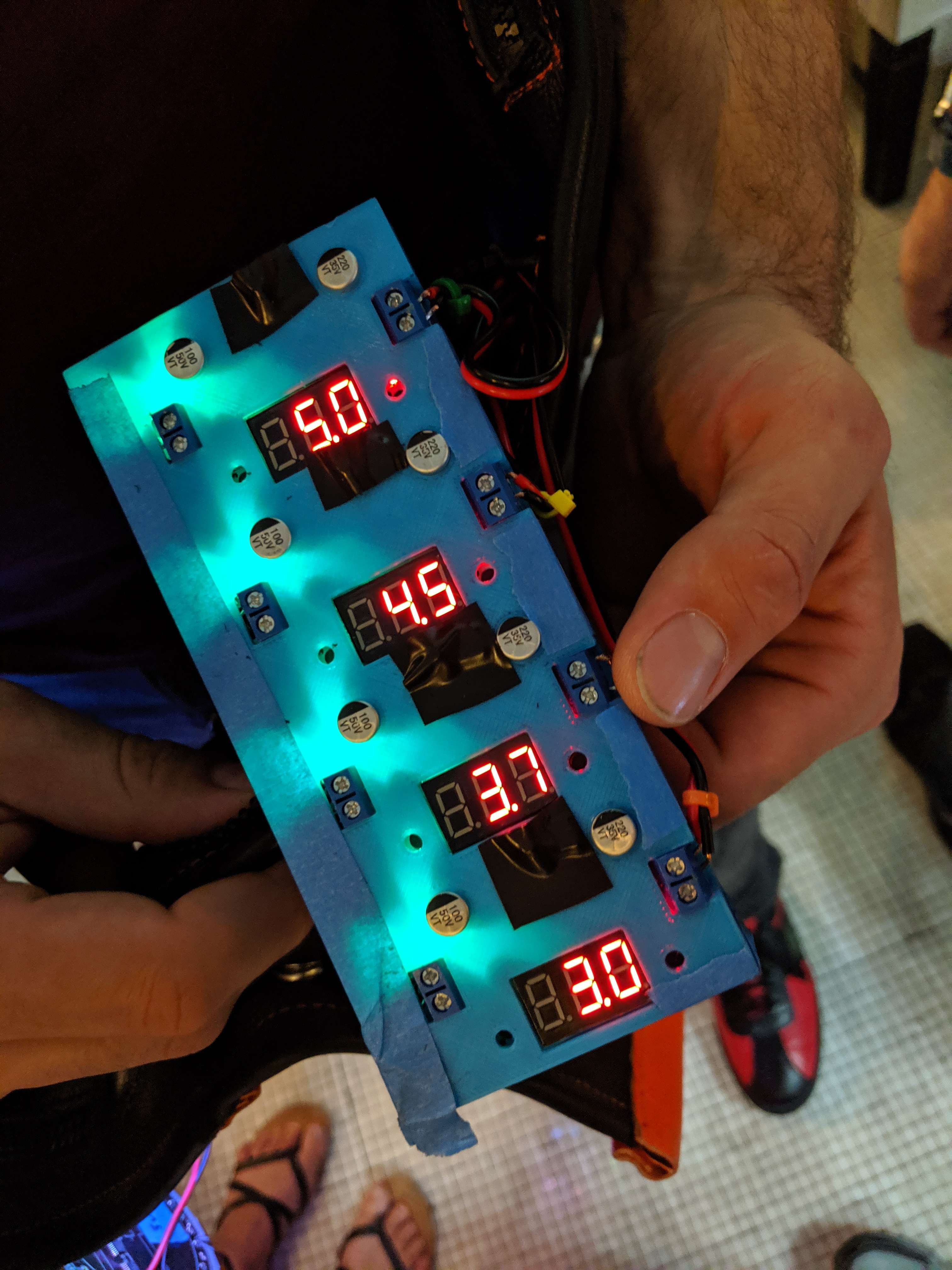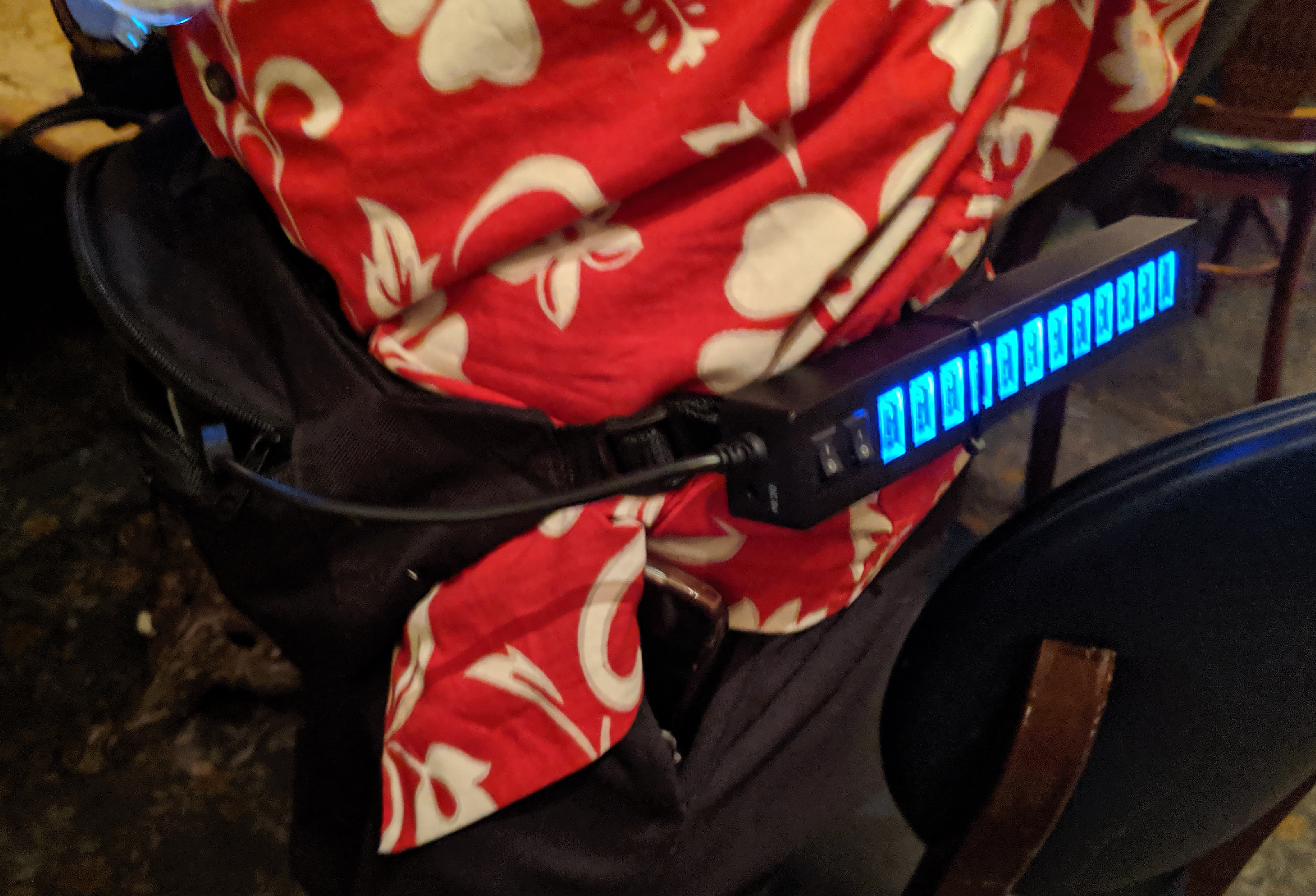 One of the members of the Whiskey Pirate crew came down to the meetup with a very special fanny pack. Make fun of the form factor all you want, but with two huge power banks and two USB charging strips, this utility belt can power 24 devices. It makes him the belle of the ball at the end of a long conference day.