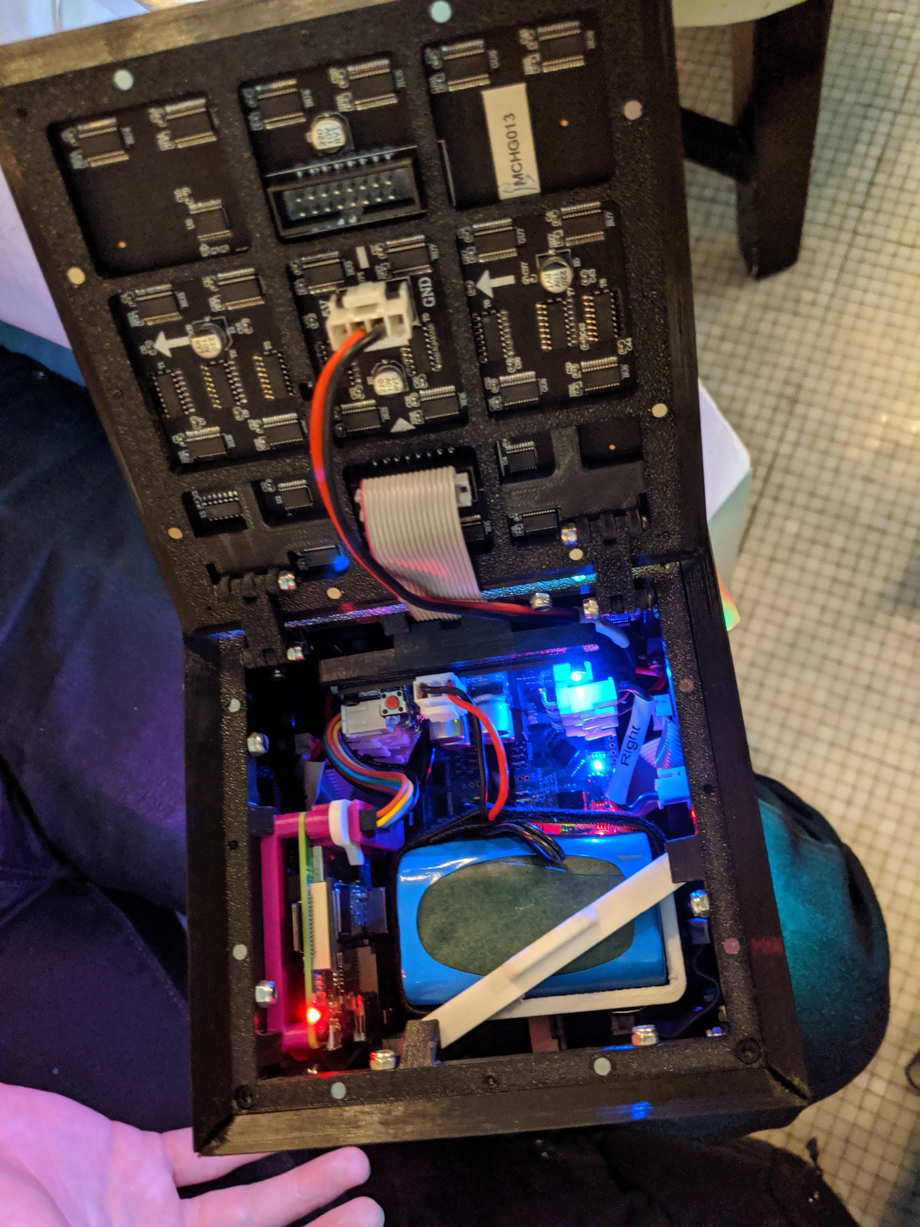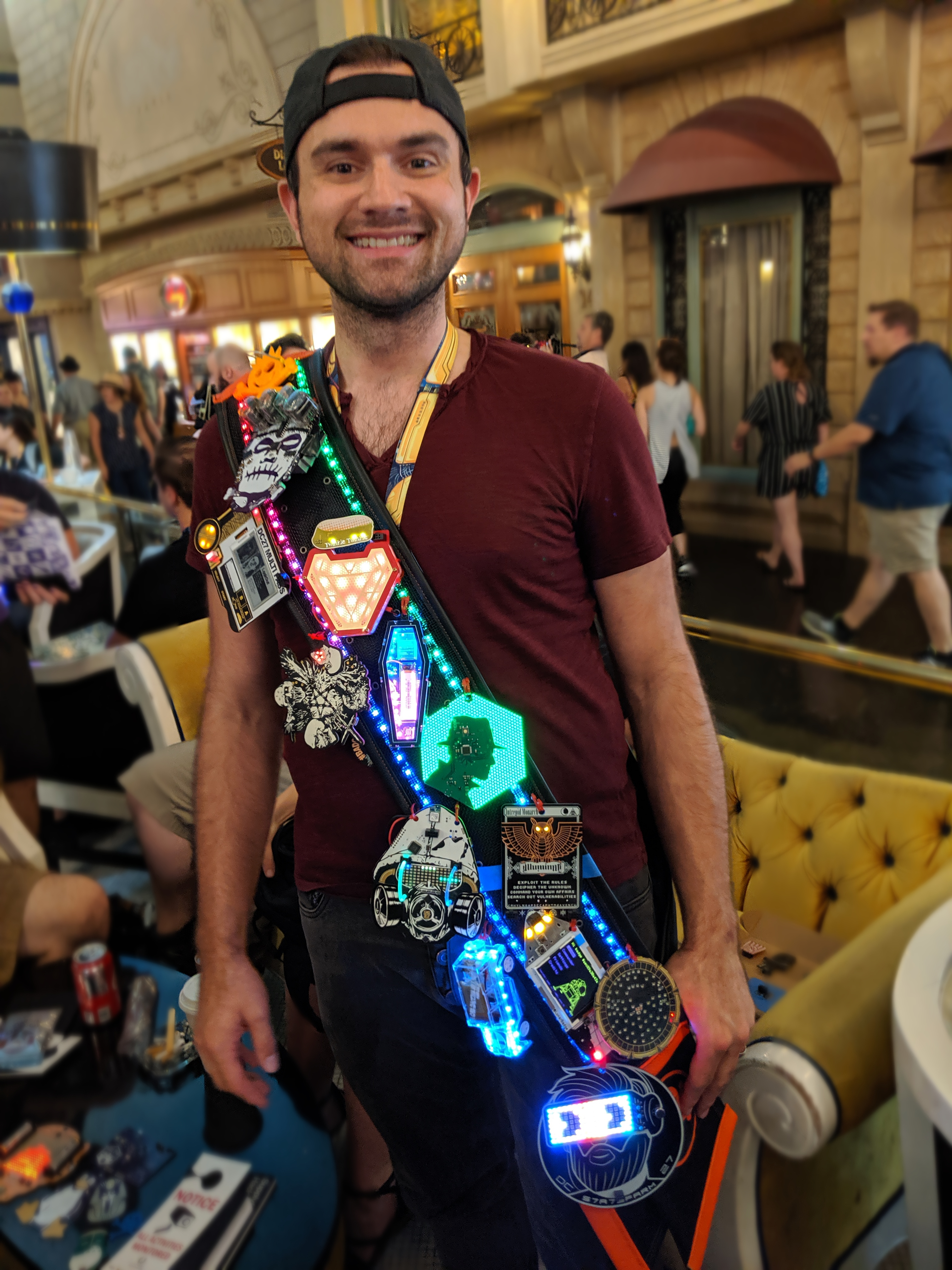 My favorite creation of DC 27 is this badge bandolier built by [LqqkOut]. Those who are bitten by the #Badgelife bug spend much of their time at DEF CON trying to acquire all the badges. this is obviously the best way ever to wear them all at the same time. The leather bandolier has a mesh layer where the badges may be hung using zip ties so they cannot fall off. Grommets allow power to be passed from the inside of the bandolier, where a set of huge lithium batteries feed multiple regulators that can be tuned to the desired voltage.