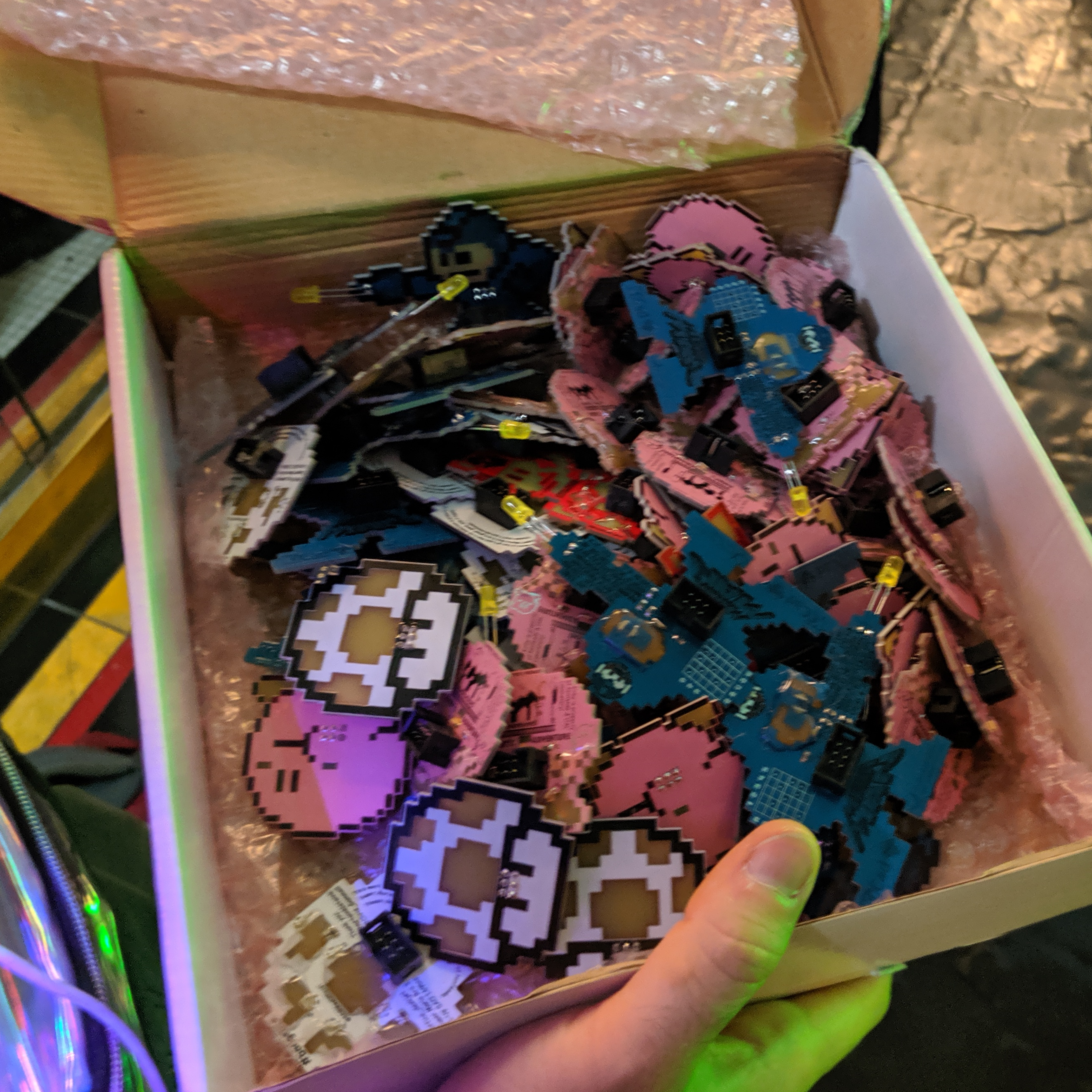 Anyone on the hunt for awesome badge add-ons came to the right place. People were making it rain with small circuit boards. I particularly enjoyed this entire box of 1Up, Kirby, Megaman, and Mario add-ons.