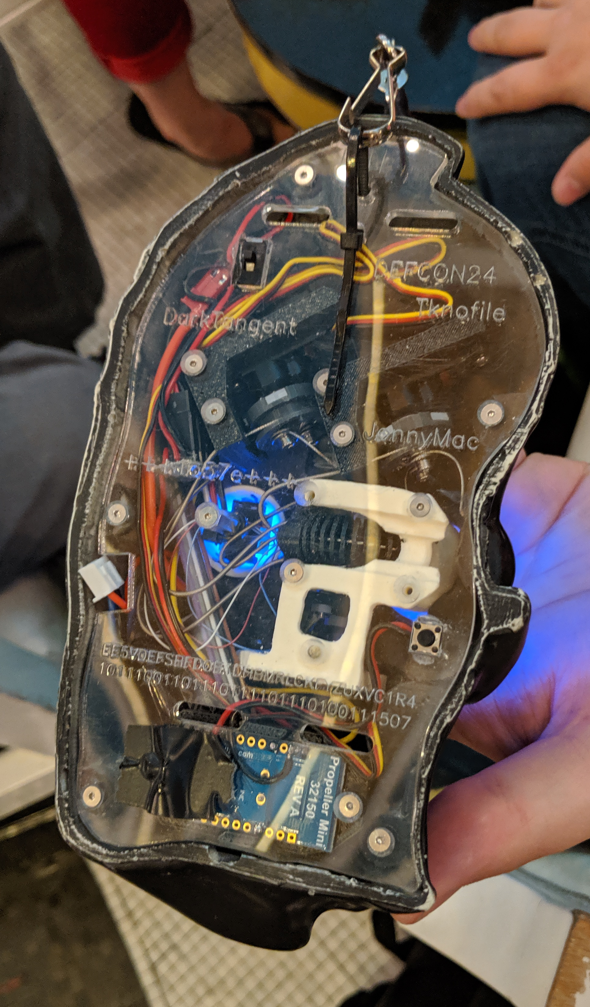 The killer detail on this is that one of the illuminated eyeballs is able to telescope out of the head of the skull. But wait, it gets even better! Once extended, that eye can look around in all directions. The badge is the work of [LosT], the long-time DEF CON puzzle master, who did the smart thing with this build: the back is clear acrylic so you can see what’s going on. A series of Bowden cables connect the eyeball to some servo motors. It’s an incredible mechanism and a delightful surprise to see it in real life!
