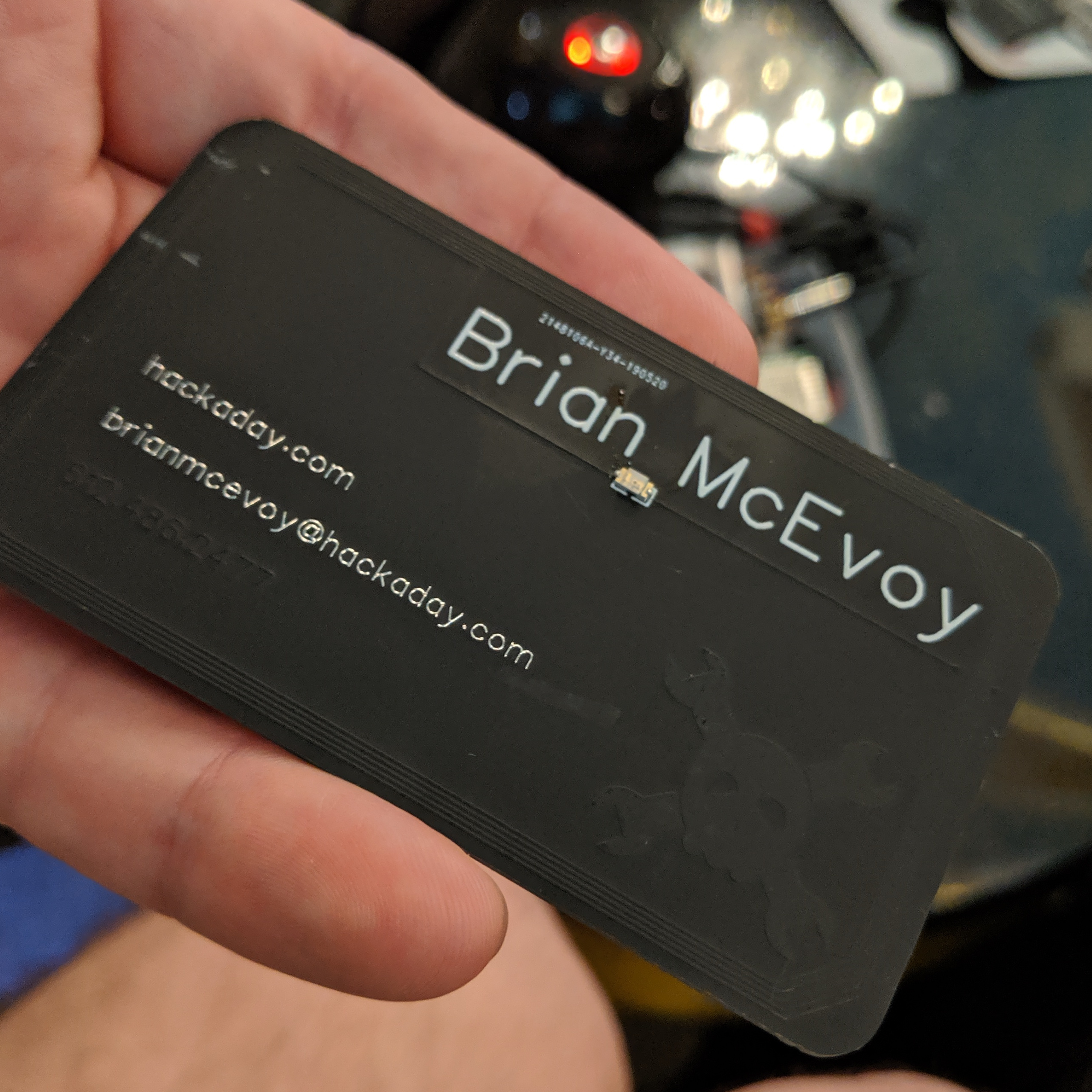 Hackaday’s own [Brian McEvoy] showed up and brought the best Hackaday business cards I’ve ever seen. It’s PCB with matte black solder mask. [Brian] leveraged the trick of using the copper layer as a second tone of black. This makes the use of white silk screen really stand out. The business card detects NFC and RFID reader fields; hold it up to the back of your phone and the LED comes alive.