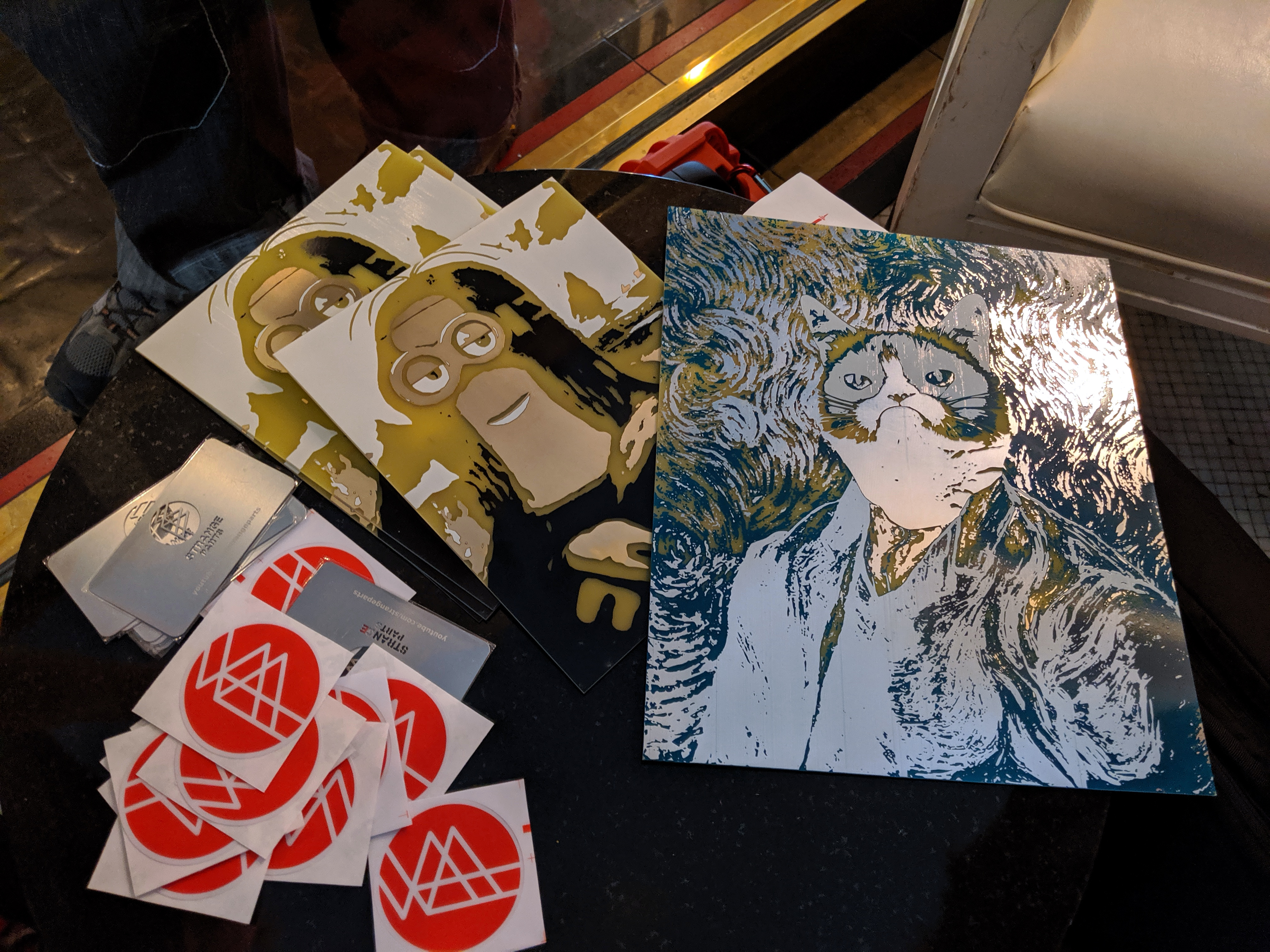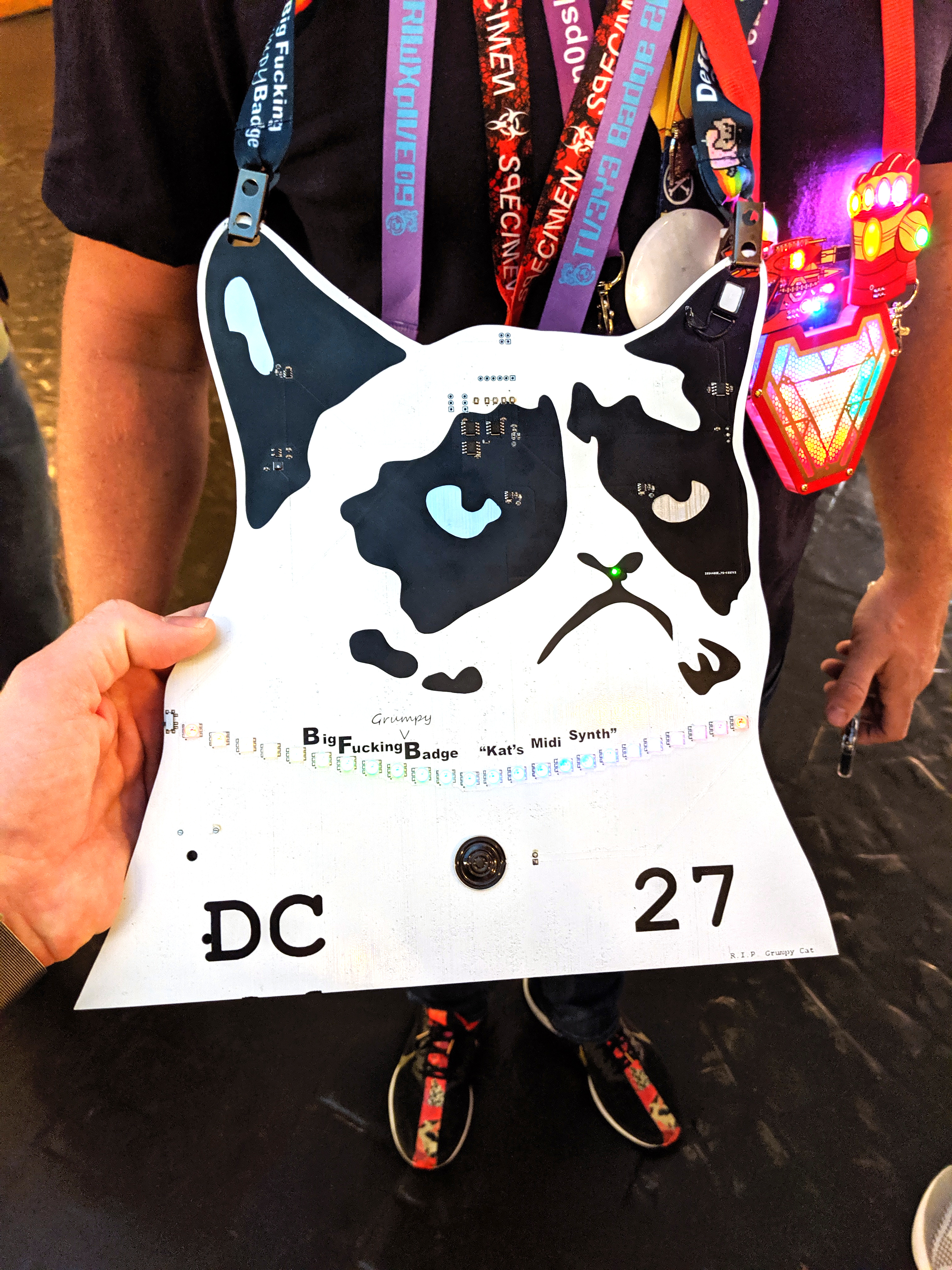 My friend [Scotty Allen] (you know him from Strange Parts) showed up with the largest PCB panels at the meetup. Both of them are “art”, but it’s meme art so… anyway, he was also wearing a huge grumpy cat around his neck. Are memes the ultimate target for circuit boards?