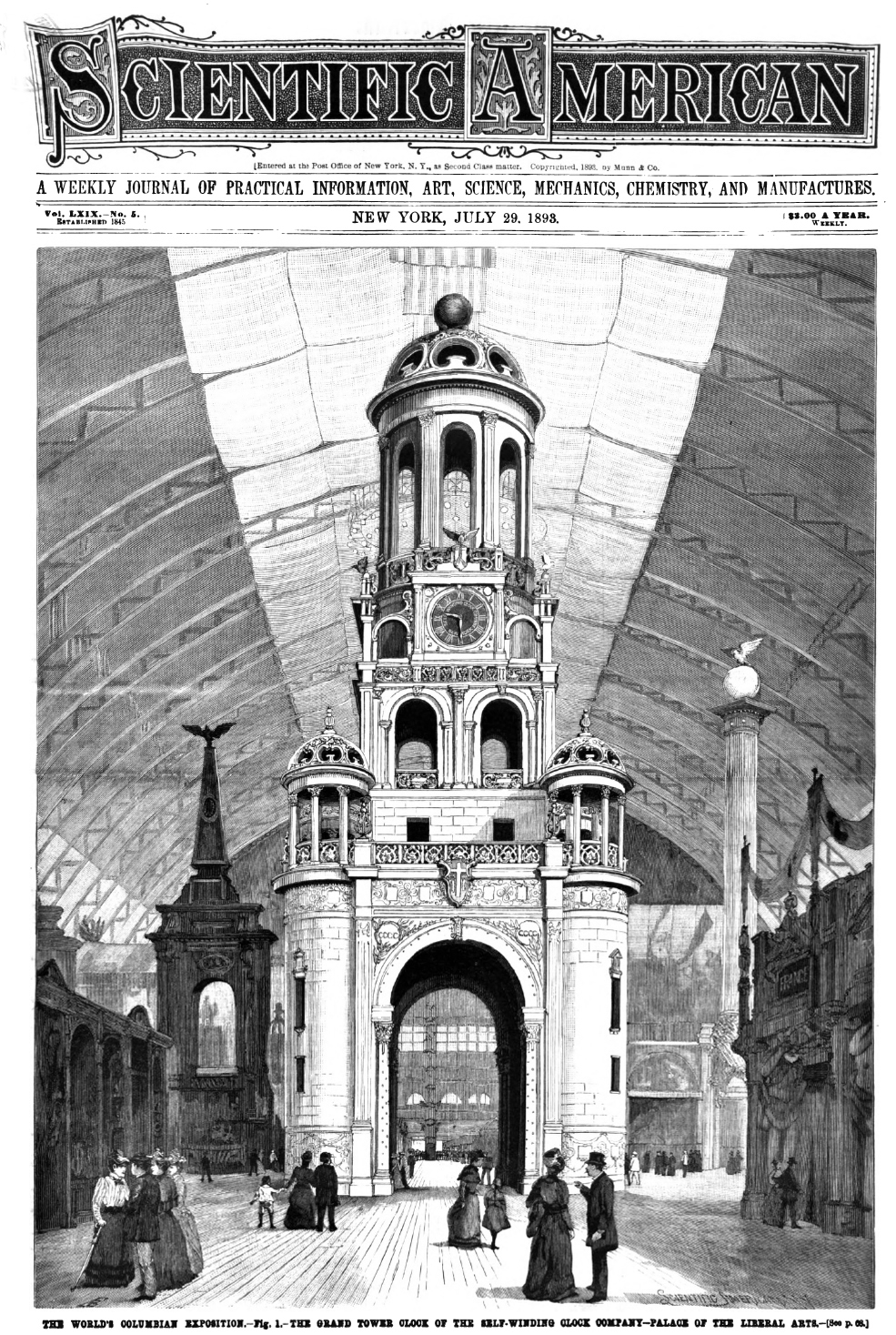 Self Winding Clock Company, Grand Tower Clock, displayed at the Palace of Liberal Arts at the 1893 Columbian Exposition, image from Scientific American, July 29, 1893.