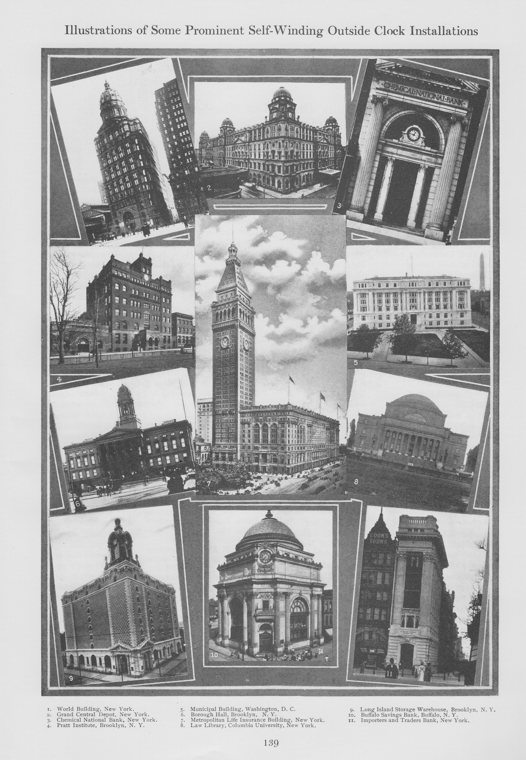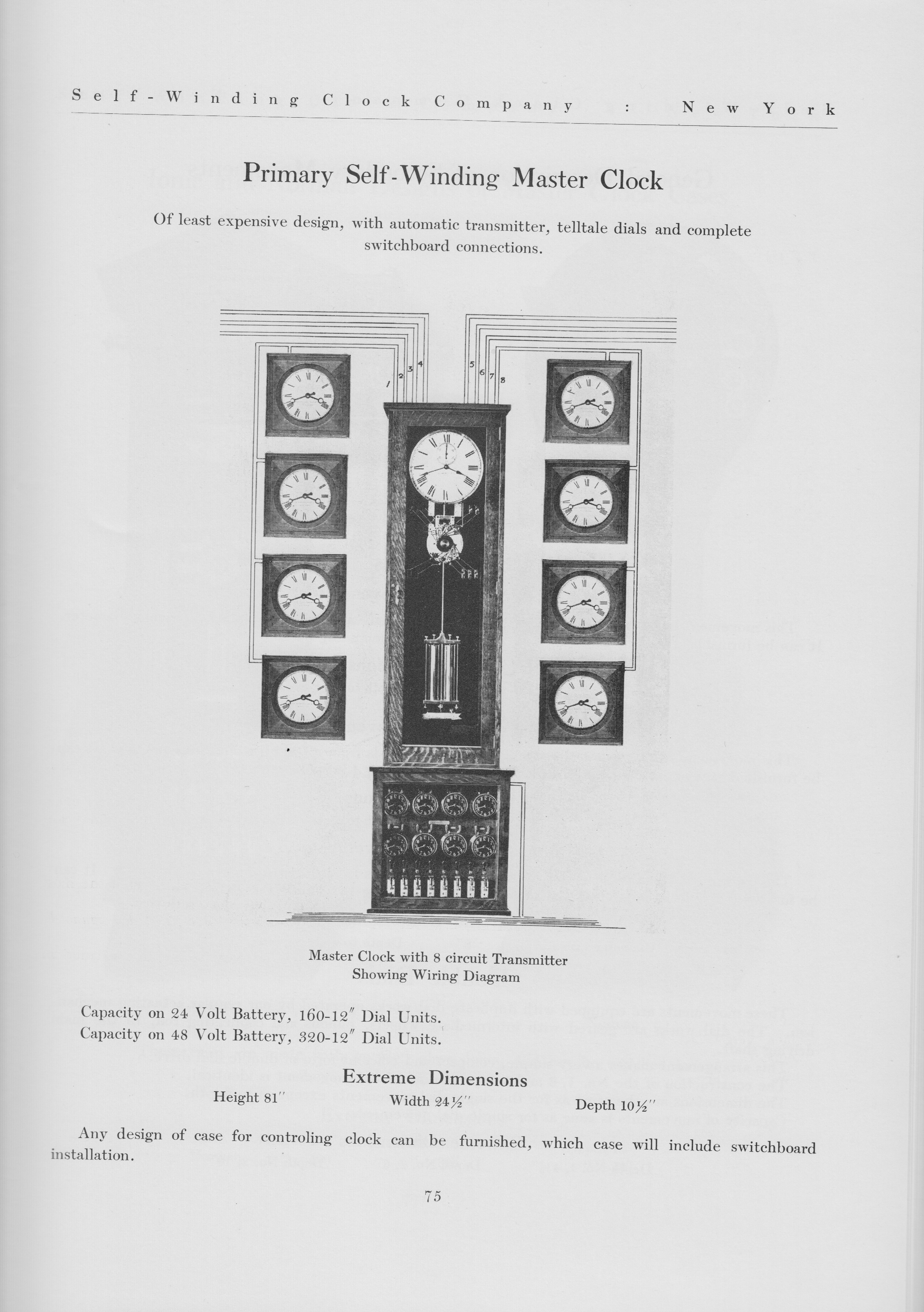 Secondary clocks were electronic repeaters that would simply repeat the time indicated on the master clock using electromagnetic solenoids, updating the time displayed on their clock faces every 30 seconds. Any number of secondary clocks could be used in large scale installations. This clock system and its precision timing service was very popular. Shown below are many prominent examples of Self-Winding-Clock installations as of 1908.