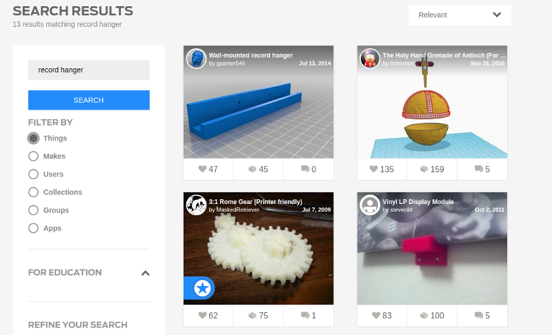 Not a great result, but hardly atypical for the site. Any regular Thingiverse user will likely have a similar search horror story to recount. Still, it’s better than what Pinshape and YouMagine can muster. On those sites, the search term “record hanger” gives us precisely zero results at the time of this writing.
