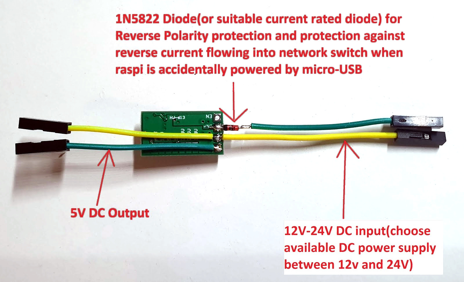 The rest of the $2 budget is mostly spent on wiring and heatshrink, resulting in a very compact PoE solution that plugs straight into the PoE header on the Raspberry Pi 3 board, with the buck converter outputs going into the ground and +5V pins on the Raspberry Pi’s GPIO header.
