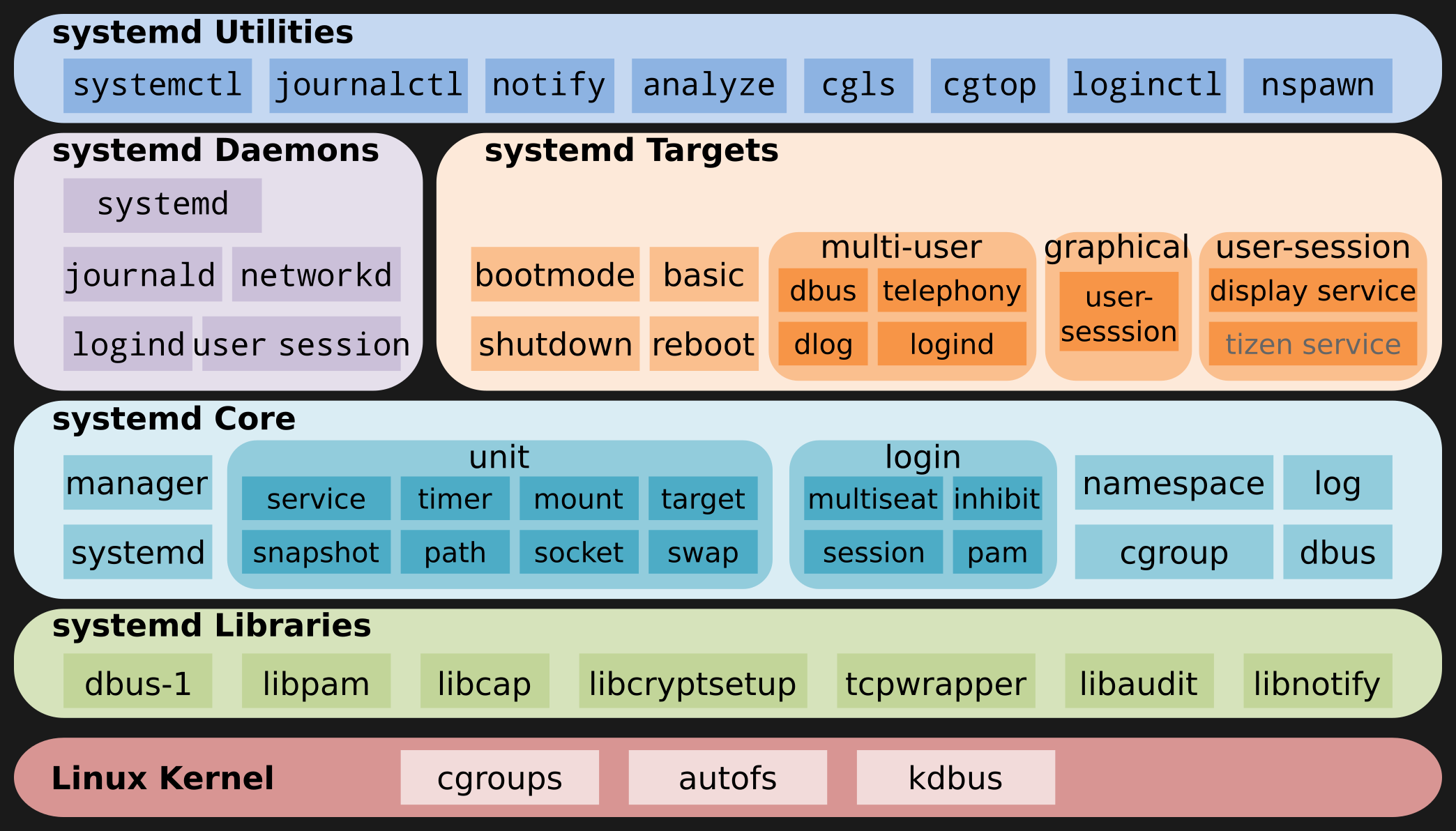 Before we get into the homed part of the endeavor, let’s bring everyone on the same page about systemd itself. In simple words, systemd handles everything that lies beyond the kernel’s tasks to start up the system: setting up the user space and providing everything required to get all system processes and daemons running, and managing those processes along the way. It’s both replacing the old init process running with PID 1, and providing an administrative layer between the kernel and user space, and as such, is coming with a whole suite of additional tools and components to achieve all that: system logger, login handling, network management, IPC for communication between each part, and so on. So, what was once handled by all sorts of single-purpose tools has since become part of systemd itself, which is one source of resentment from people latching on to the “one tool, one job” philosophy.