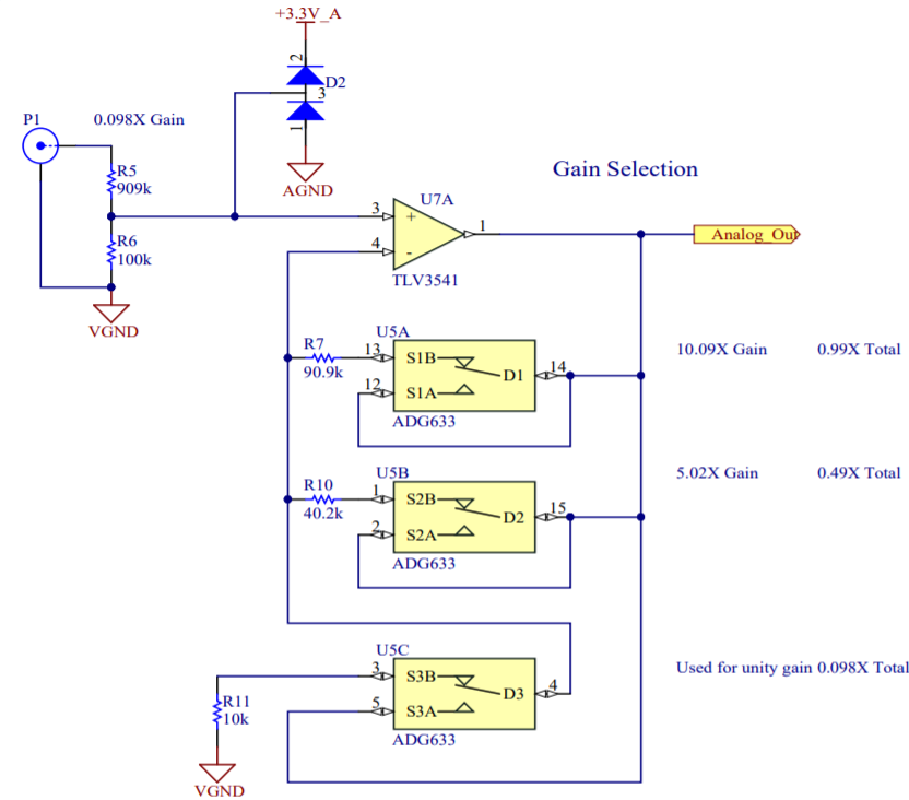 The next component is a variable gain stage, providing either 10x, 5x, or 1x gain corresponding to 1x, 0.5x, and 0.1x system gains. For the subsystem, a TLV3541 op-amp and ADG633 tripe SPDT analog switch are used to provide a power bandwidth around the system response due to driving concerns. Notably, the resistance of the switch is non-negligible, potentially varying with voltage. Luckily, the screen used in the oscilloscope needs 12V, so supplying 12V to the mux results in a lower voltage and thus a flatter response.